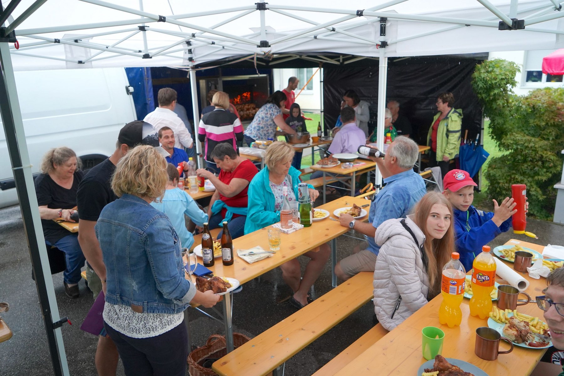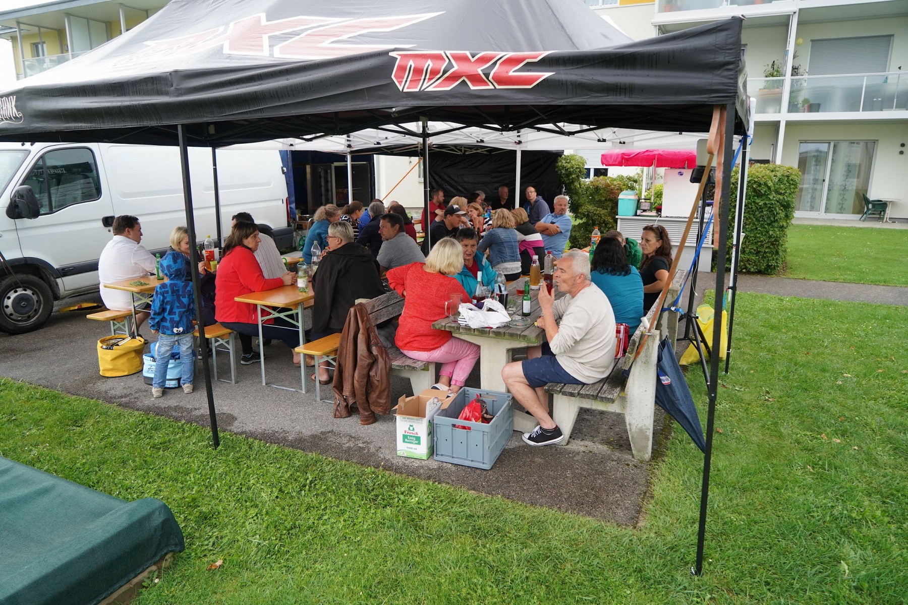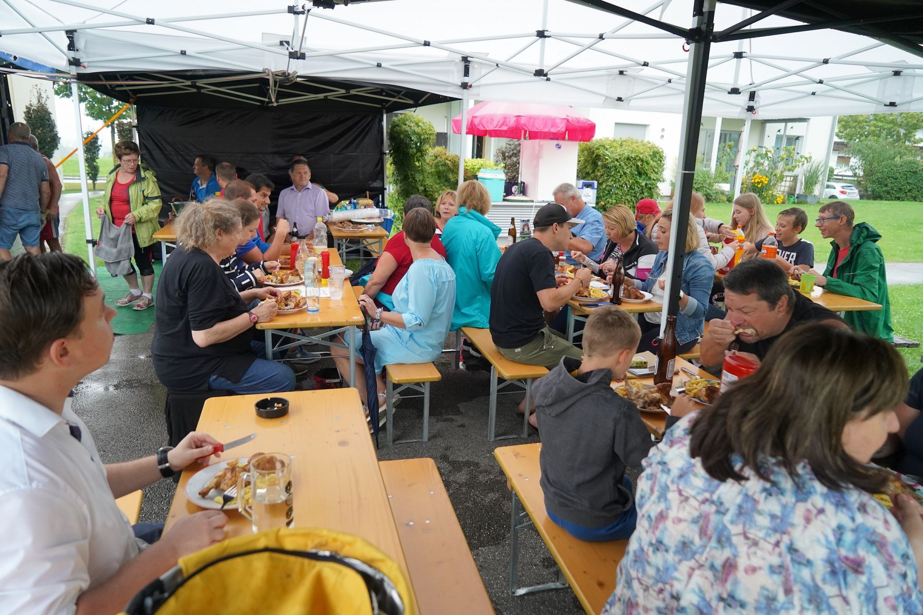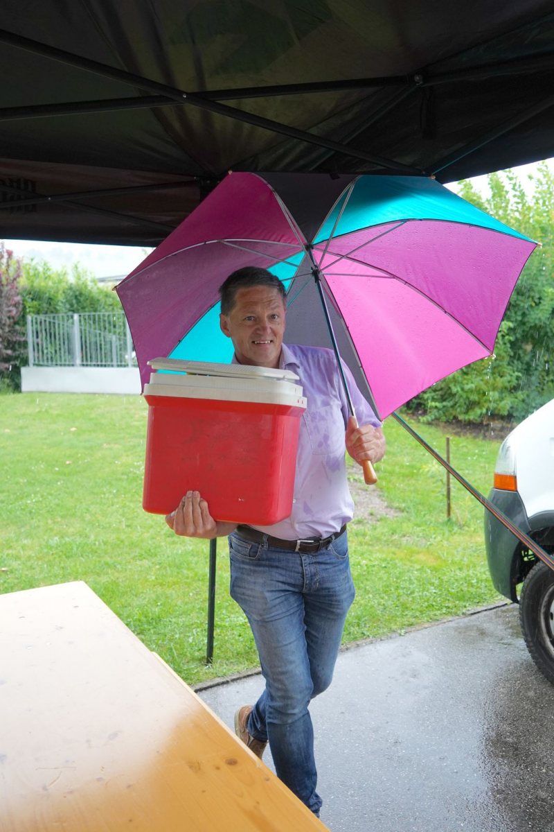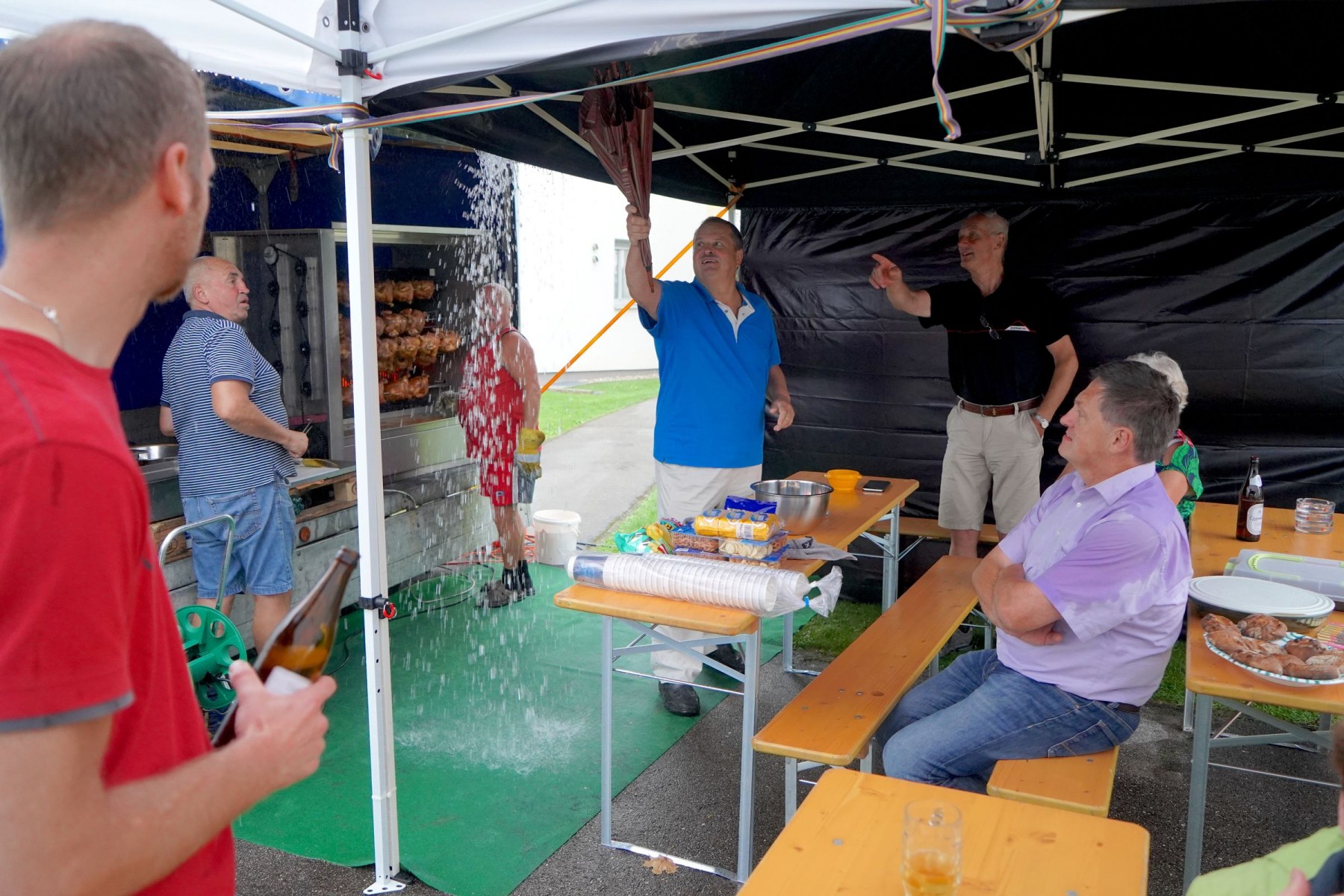 Und der wurde auch für ein kleines aber feines 10 Jahre Fest ausgenützt. Vorsorglich stellten die Festveranstalter Karl und Peter mit Mithilfe einiger Bewohner und Hendlgrillchef Reinhard drei Zelte auf. Dies war auch goldrichtig, da vor Beginn der Veranstaltung um 17:00 Uhr ein Platzregen einsetzte. Leider hat es den Ehrengast Bürgermeister Fritz STEINDL voll erwischt, als er mit Getränkespenden und Eis für die Kids zum Fest erschien. Das tat aber der Freude keinen Abbruch und BGM Steindl wurde mit kräftigen Applaus und ein gemeinsames DANKESCHÖN begrüßt. Reinhards Henderl mit Pommes haben vorzüglich geschmeckt, von einigen Hausbewohnerinnen wurden vorzügliche Kuchenspenden beigestellt und durch das großzügige Platzangebot im Freien konnte jeder den gewünschten Abstand in der Coronazeit einhalten. „Gschwandt ist lebens,- und liebenswert, wir sind als Gemeinde stolz auf dieses tolle Wohnangebot der Traunseer Siedlergemeinschaft, die auch dank Hausmeister Karl VIECHTI eine „ herzeige“ Wohnanlage ist!“, so ein sichtlich glücklicher Bürgermeister Fritz STEINDL.