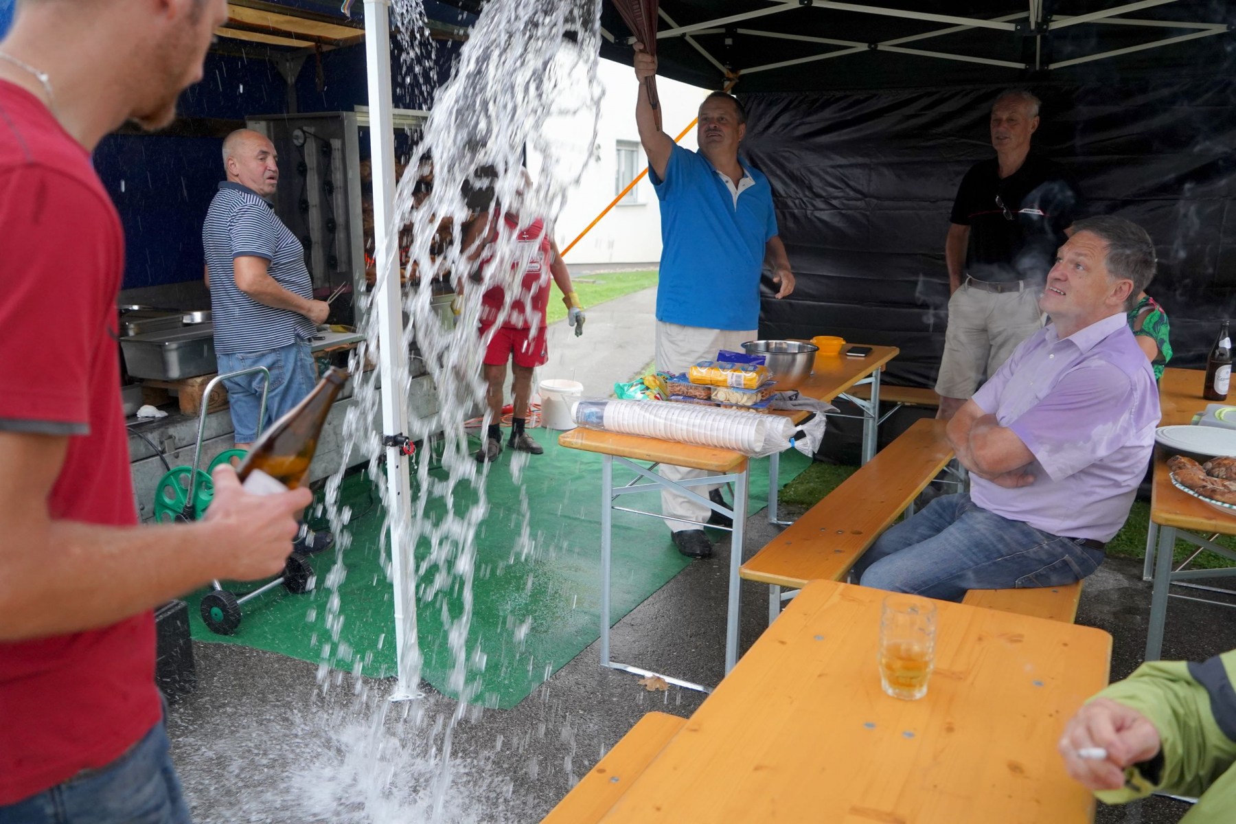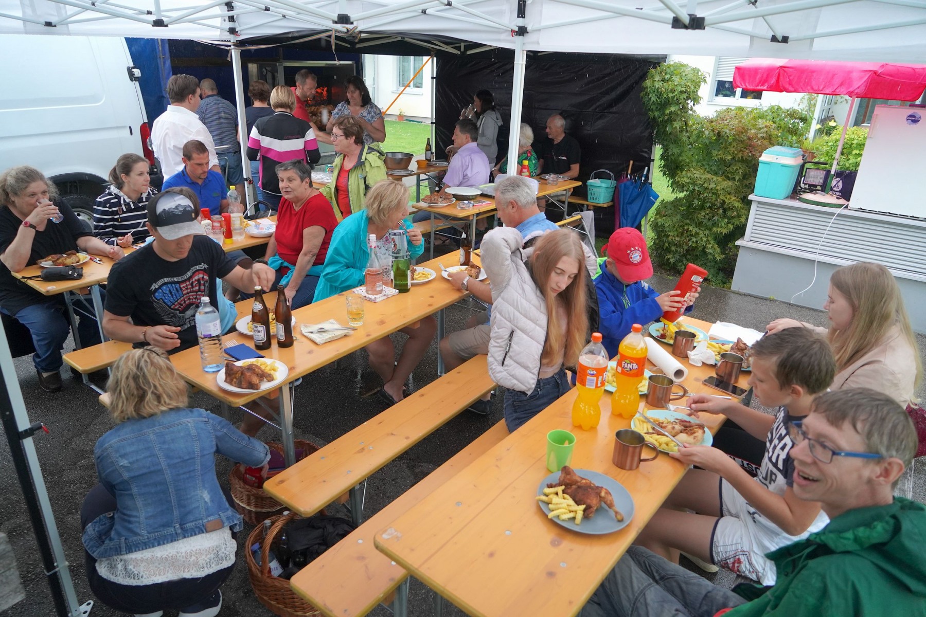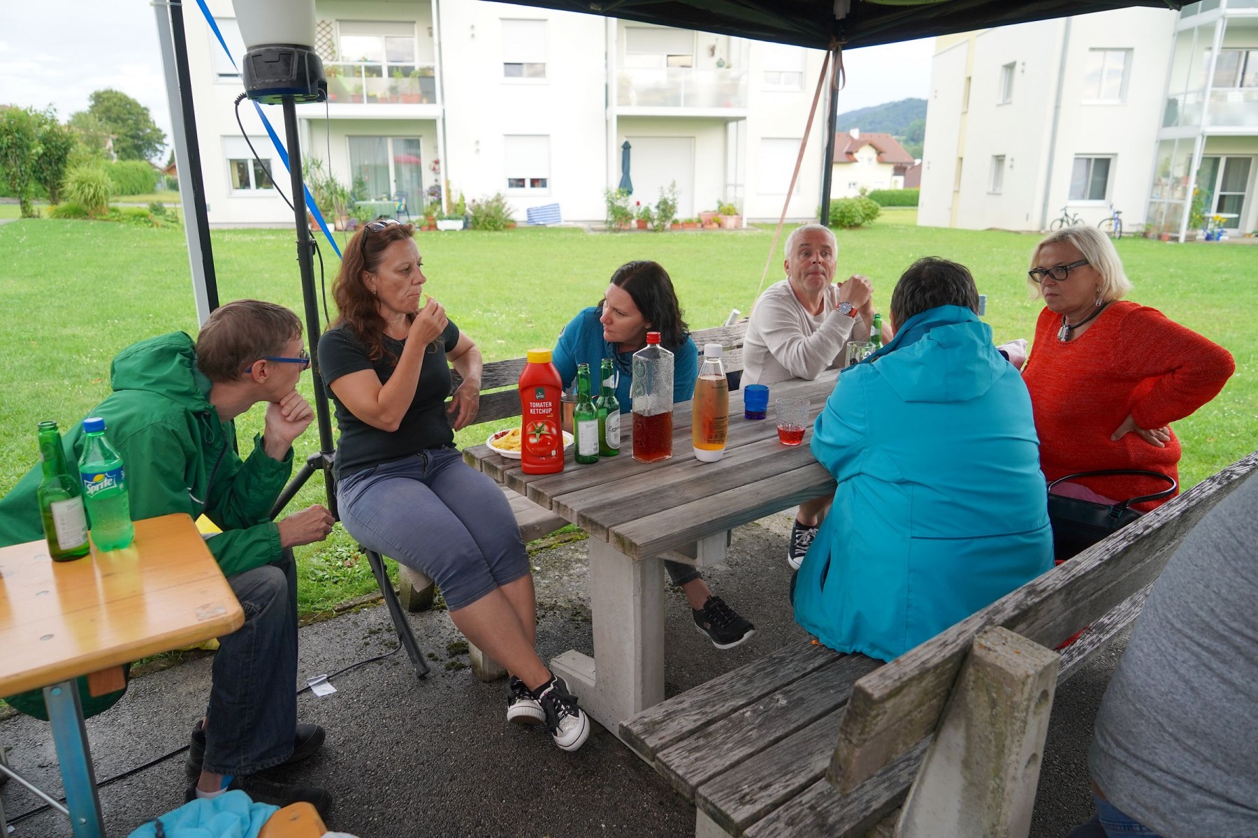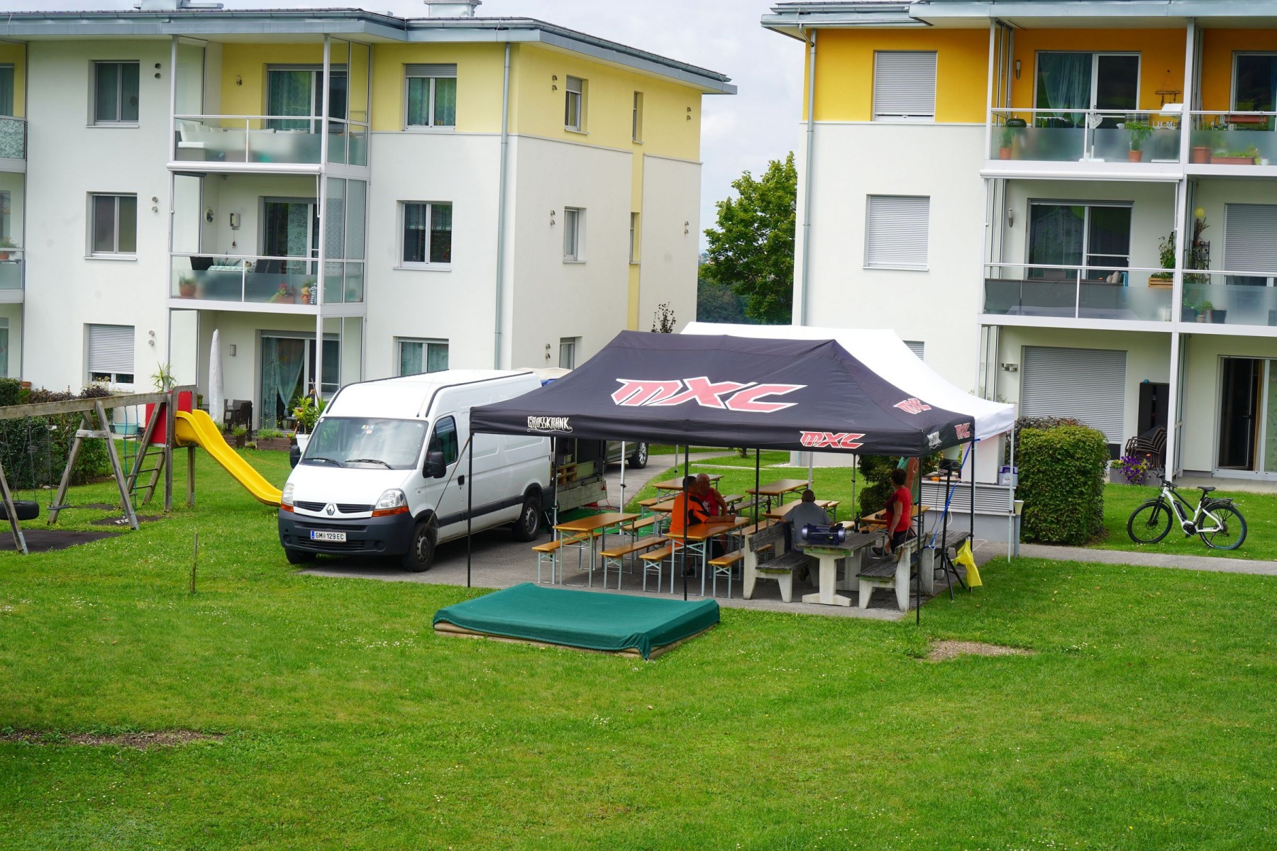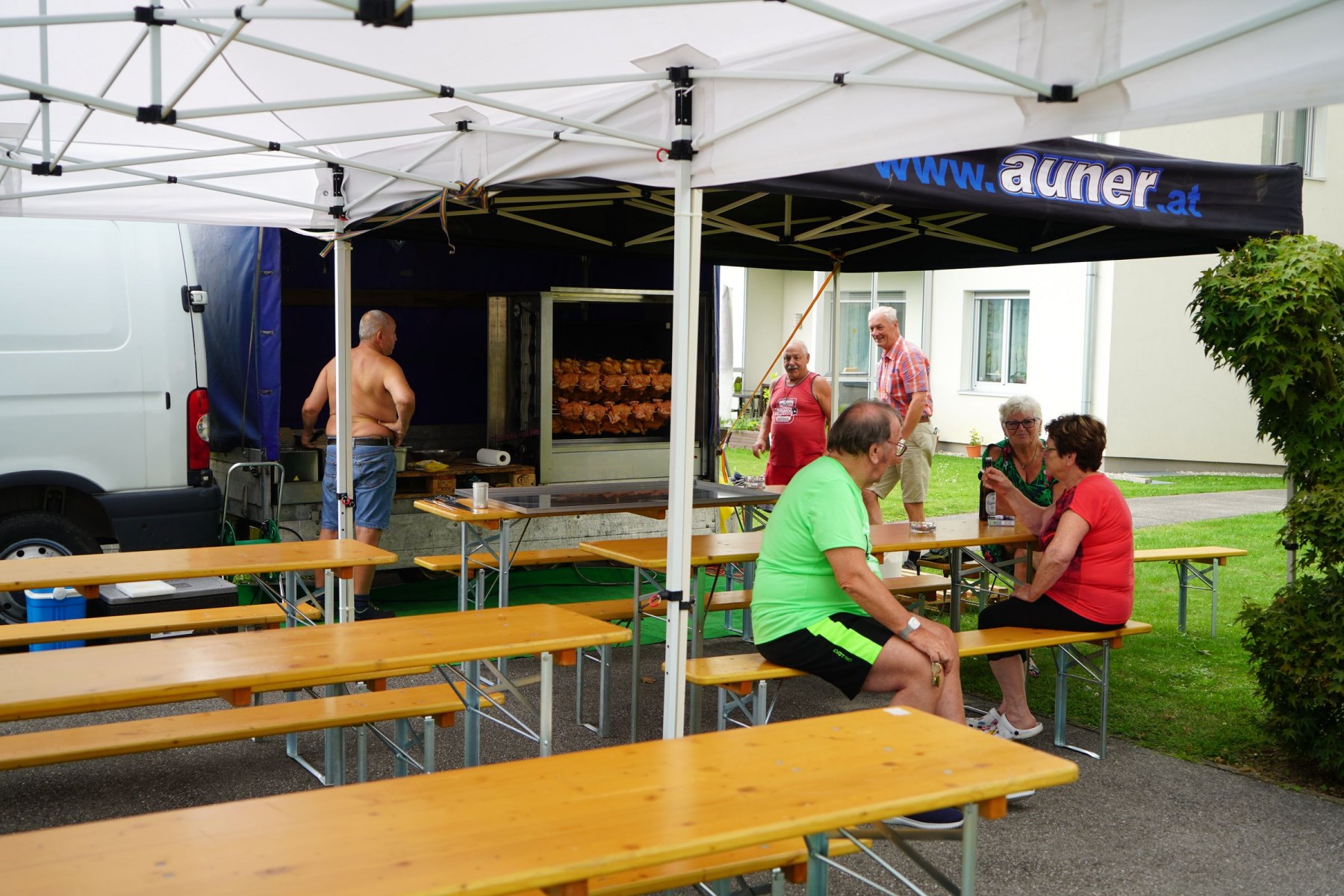 Und der wurde auch für ein kleines aber feines 10 Jahre Fest ausgenützt. Vorsorglich stellten die Festveranstalter Karl und Peter mit Mithilfe einiger Bewohner und Hendlgrillchef Reinhard drei Zelte auf. Dies war auch goldrichtig, da vor Beginn der Veranstaltung um 17:00 Uhr ein Platzregen einsetzte. Leider hat es den Ehrengast Bürgermeister Fritz STEINDL voll erwischt, als er mit Getränkespenden und Eis für die Kids zum Fest erschien. Das tat aber der Freude keinen Abbruch und BGM Steindl wurde mit kräftigen Applaus und ein gemeinsames DANKESCHÖN begrüßt. Reinhards Henderl mit Pommes haben vorzüglich geschmeckt, von einigen Hausbewohnerinnen wurden vorzügliche Kuchenspenden beigestellt und durch das großzügige Platzangebot im Freien konnte jeder den gewünschten Abstand in der Coronazeit einhalten. „Gschwandt ist lebens,- und liebenswert, wir sind als Gemeinde stolz auf dieses tolle Wohnangebot der Traunseer Siedlergemeinschaft, die auch dank Hausmeister Karl VIECHTI eine „ herzeige“ Wohnanlage ist!“, so ein sichtlich glücklicher Bürgermeister Fritz STEINDL.