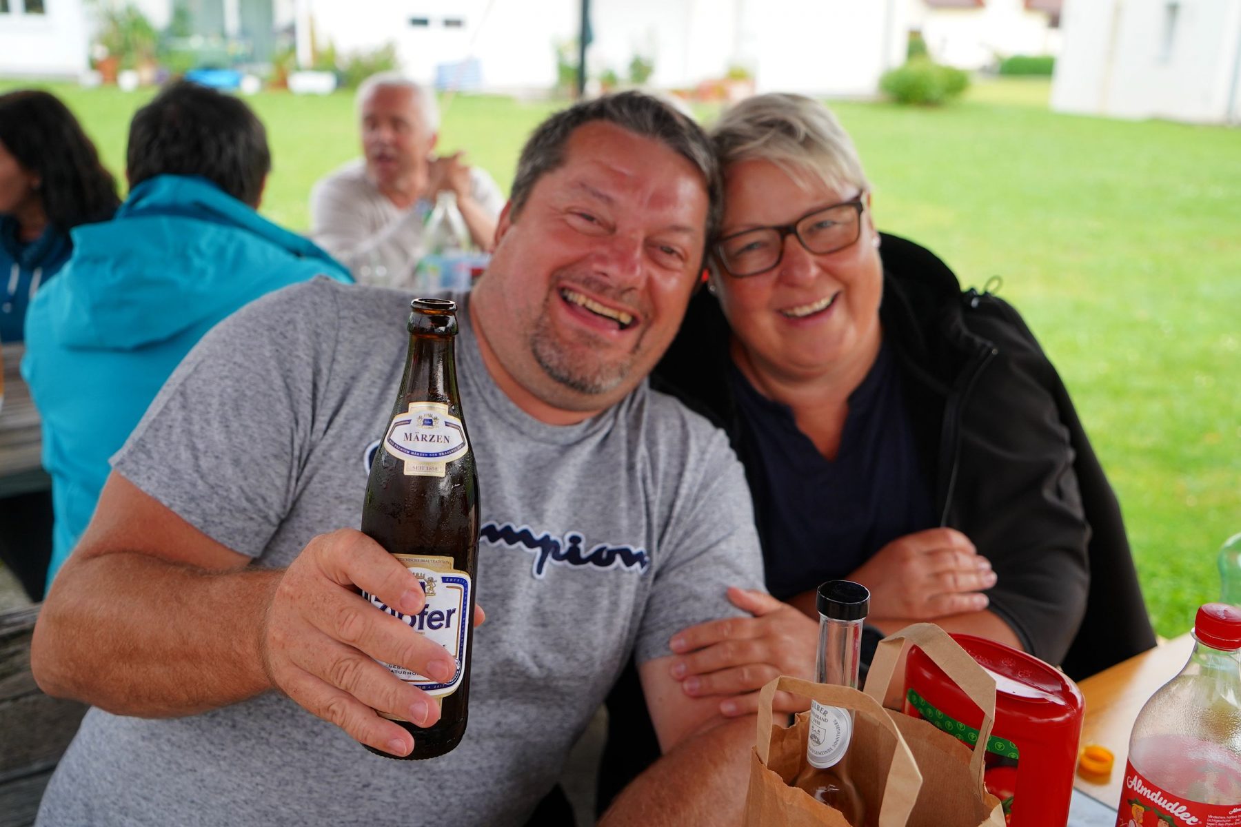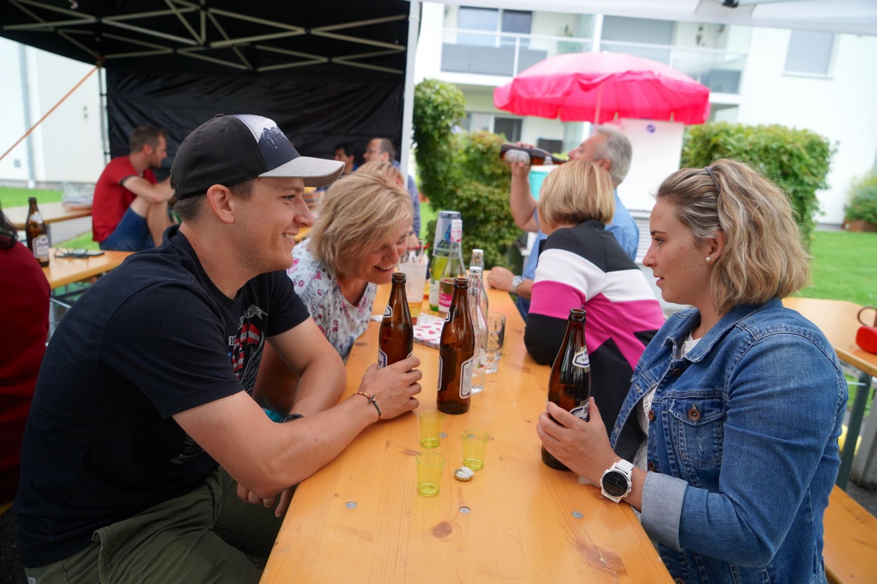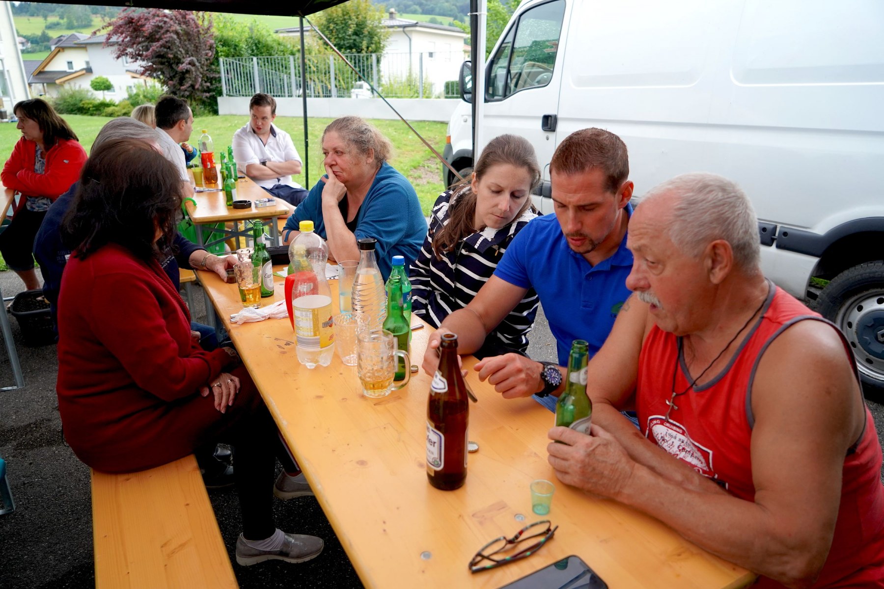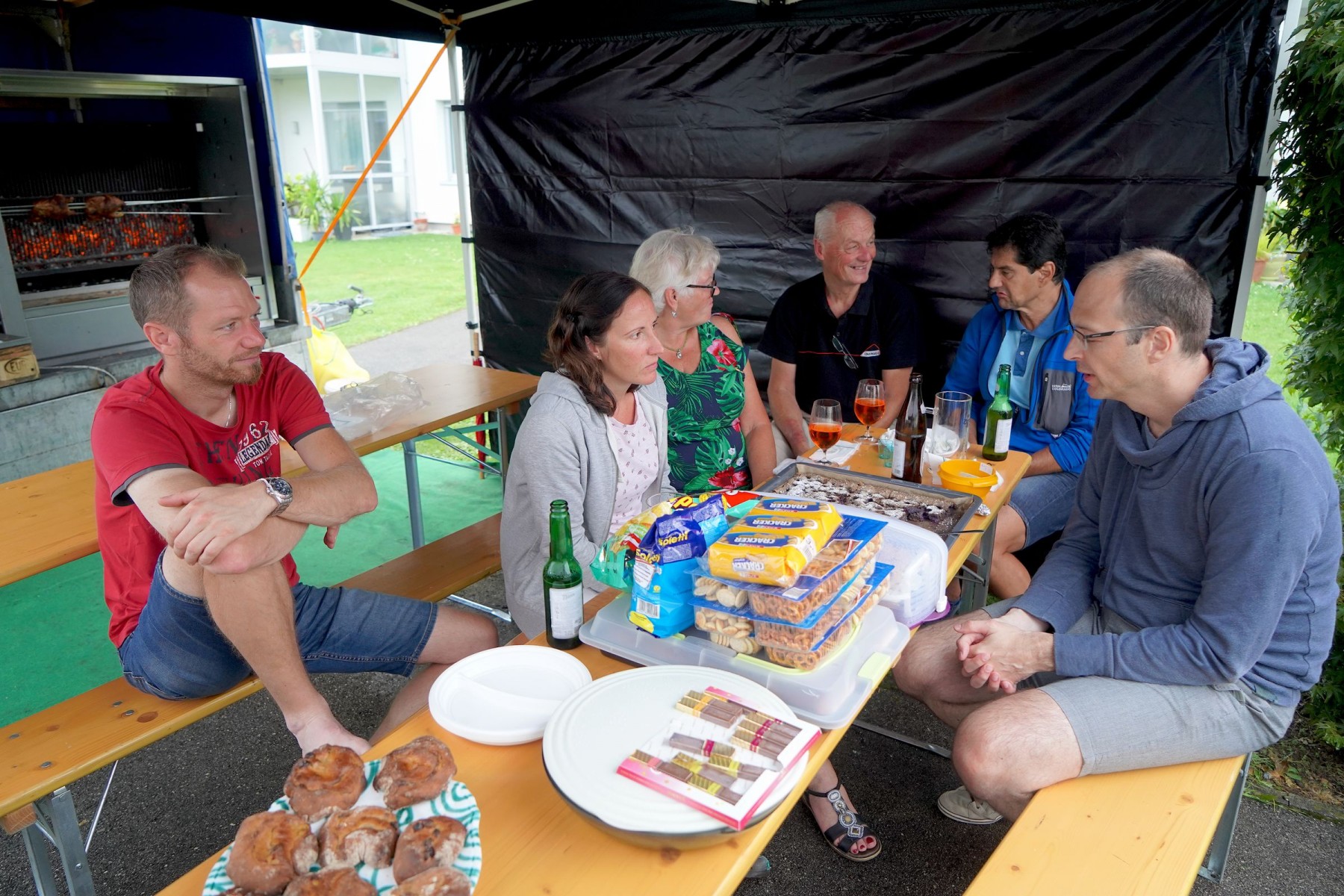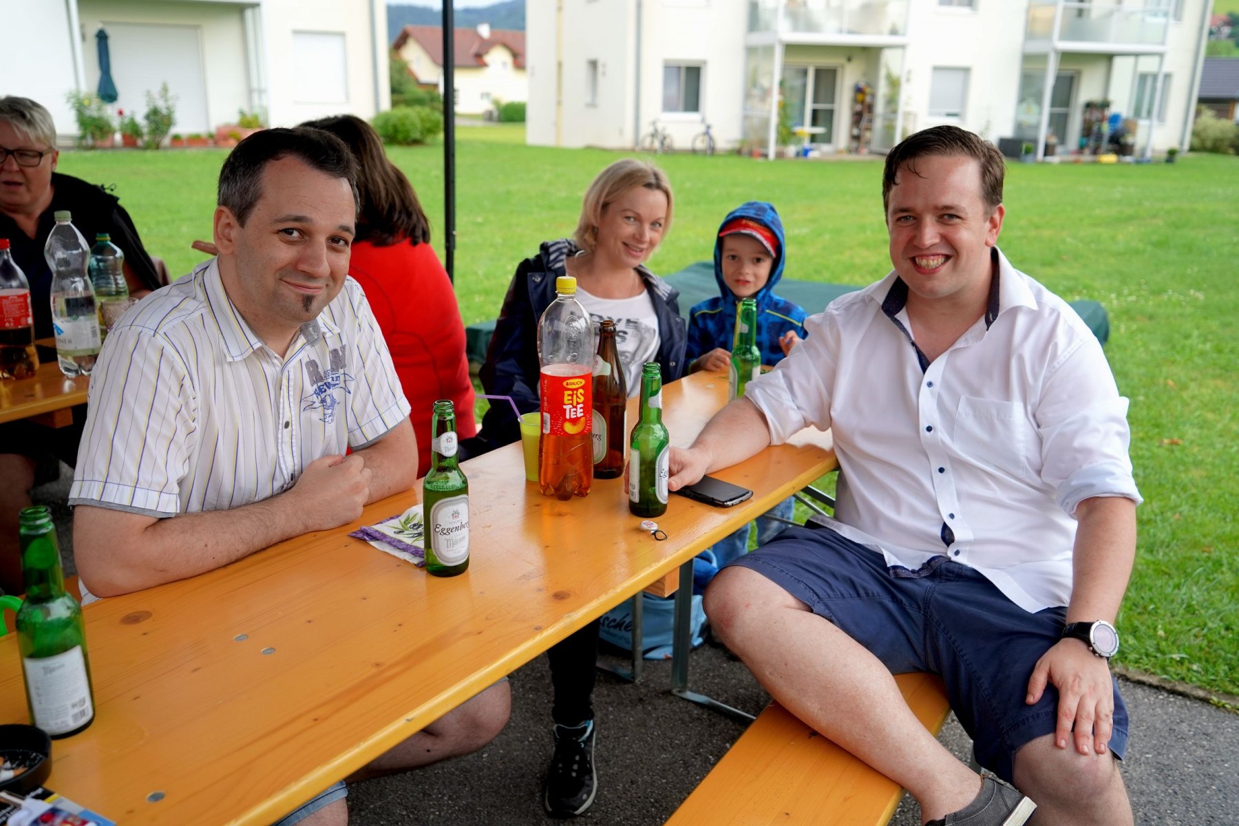 Und der wurde auch für ein kleines aber feines 10 Jahre Fest ausgenützt. Vorsorglich stellten die Festveranstalter Karl und Peter mit Mithilfe einiger Bewohner und Hendlgrillchef Reinhard drei Zelte auf. Dies war auch goldrichtig, da vor Beginn der Veranstaltung um 17:00 Uhr ein Platzregen einsetzte. Leider hat es den Ehrengast Bürgermeister Fritz STEINDL voll erwischt, als er mit Getränkespenden und Eis für die Kids zum Fest erschien. Das tat aber der Freude keinen Abbruch und BGM Steindl wurde mit kräftigen Applaus und ein gemeinsames DANKESCHÖN begrüßt. Reinhards Henderl mit Pommes haben vorzüglich geschmeckt, von einigen Hausbewohnerinnen wurden vorzügliche Kuchenspenden beigestellt und durch das großzügige Platzangebot im Freien konnte jeder den gewünschten Abstand in der Coronazeit einhalten. „Gschwandt ist lebens,- und liebenswert, wir sind als Gemeinde stolz auf dieses tolle Wohnangebot der Traunseer Siedlergemeinschaft, die auch dank Hausmeister Karl VIECHTI eine „ herzeige“ Wohnanlage ist!“, so ein sichtlich glücklicher Bürgermeister Fritz STEINDL.