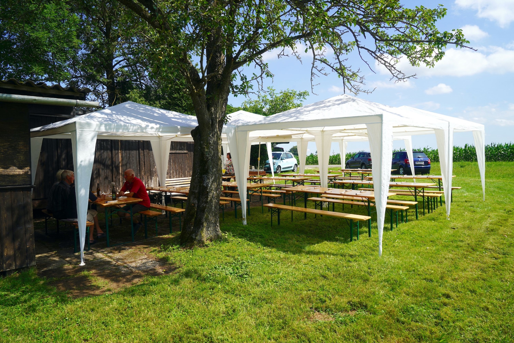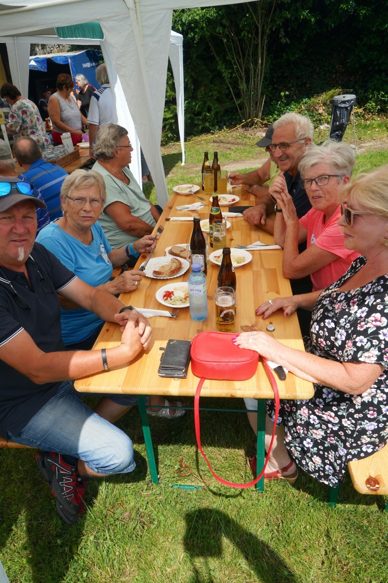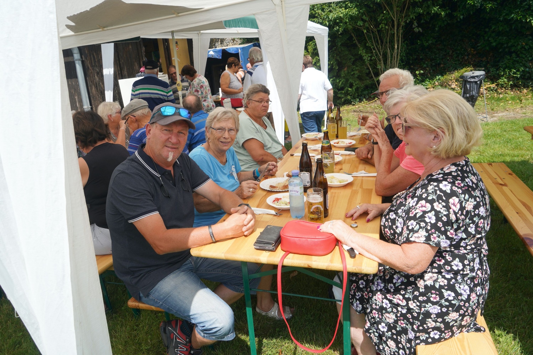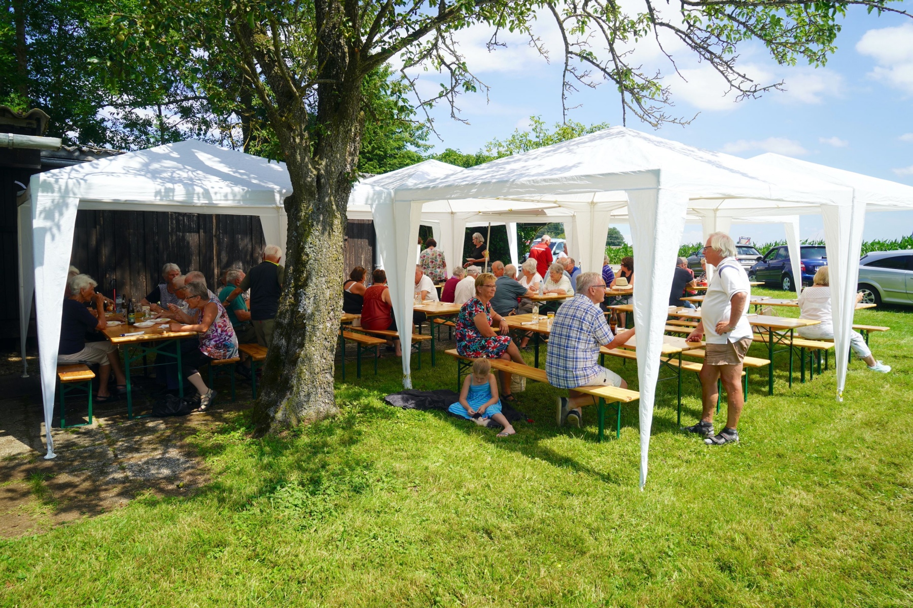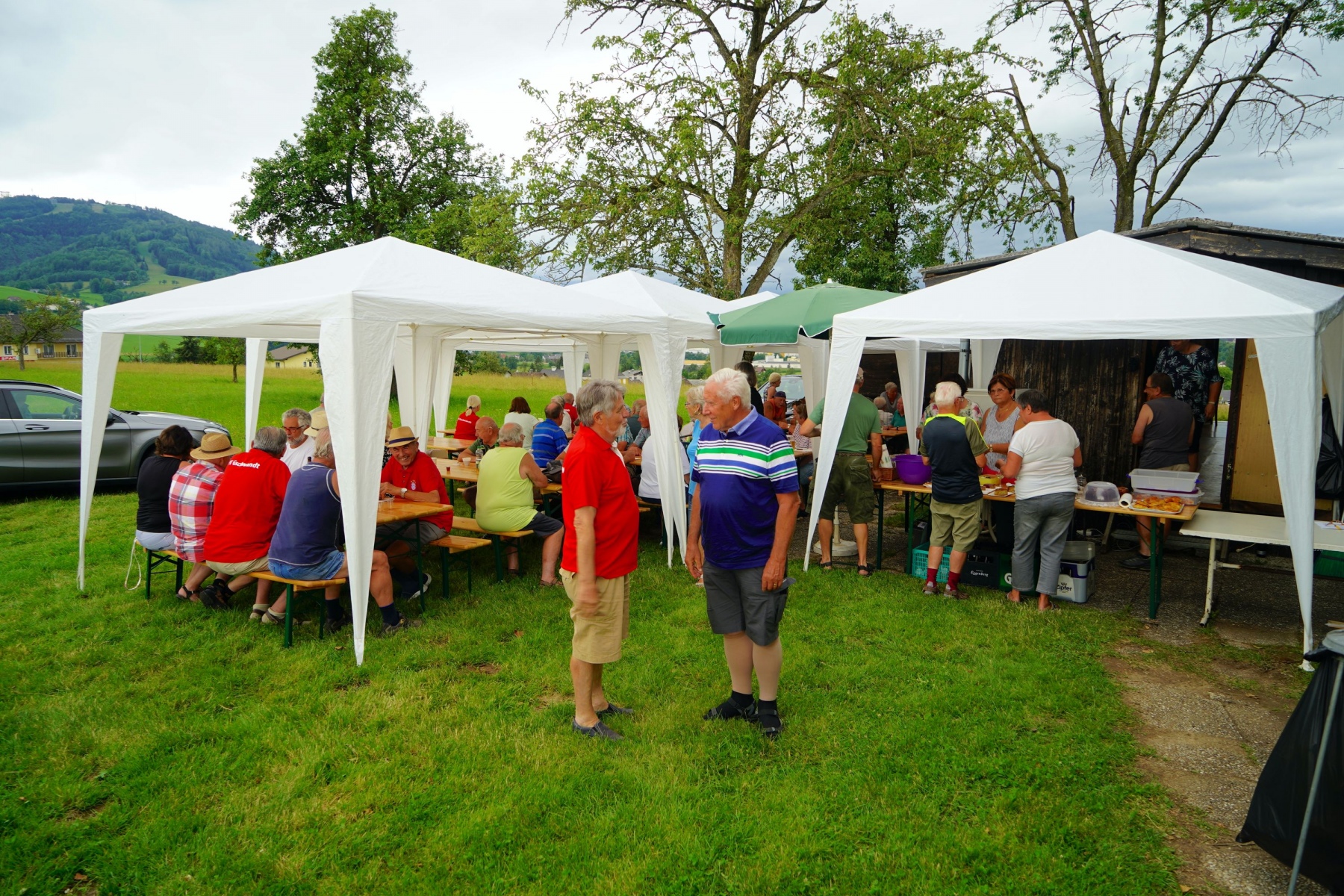 Um 11:30 Uhr trafen dann die geladenen Mitglieder nach und nach ein und schließlich waren es dann an die 70 Gäste, die sich prächtig unterhielten. Die Grillhenderl, zubereitet durch Reinhard AIGNER und Grillspezialitäten durch Karl VIECHTBAUER schmeckten wie immer köstlich und das Salat,- und Kuchenbuffet, dass die weiblichen Vorstandsmitglieder beisteuerten spielte alle Stückerl. Musikalisch spielte Walter mit der Gitarre und Peter mit der Steirischen auf und dazu wurde kräftig gesungen und applaudiert. Gegen 16:00 Uhr verdunkelte sich der Himmel und ein kurzes Gewitter mit Starkregen beendete für einen Großteil der Gäste abrupt den gemütlichen Nachmittag. Natürlich blieben aber „der harte Kern“ unter den Zelten sitzen und feierten fröhlich bis in den Abend hinein weiter.