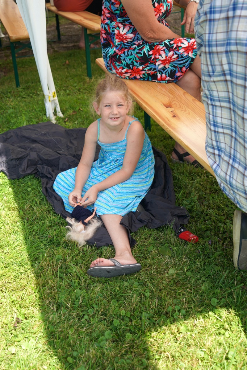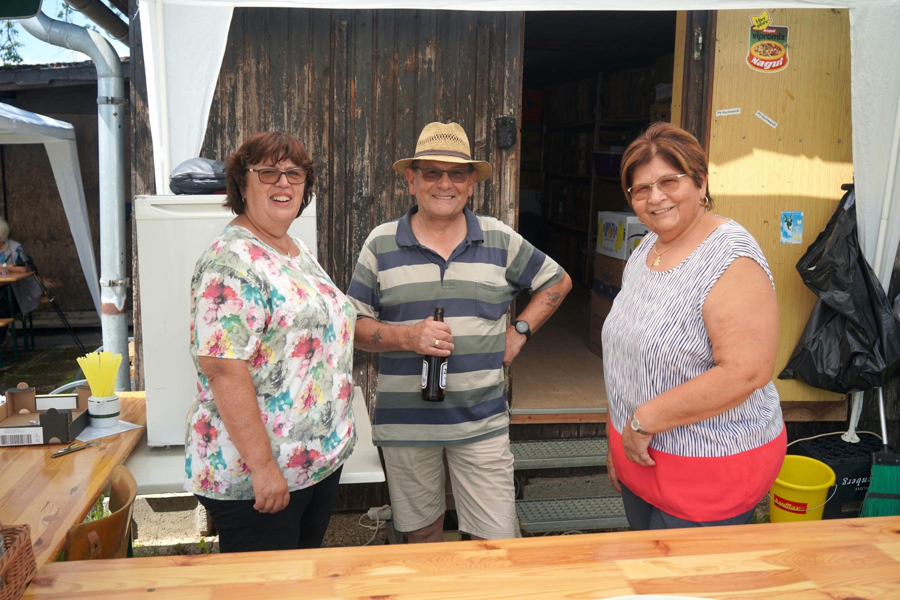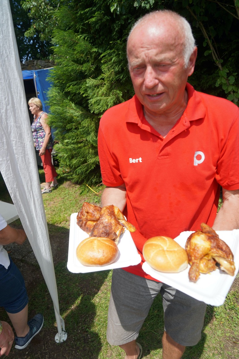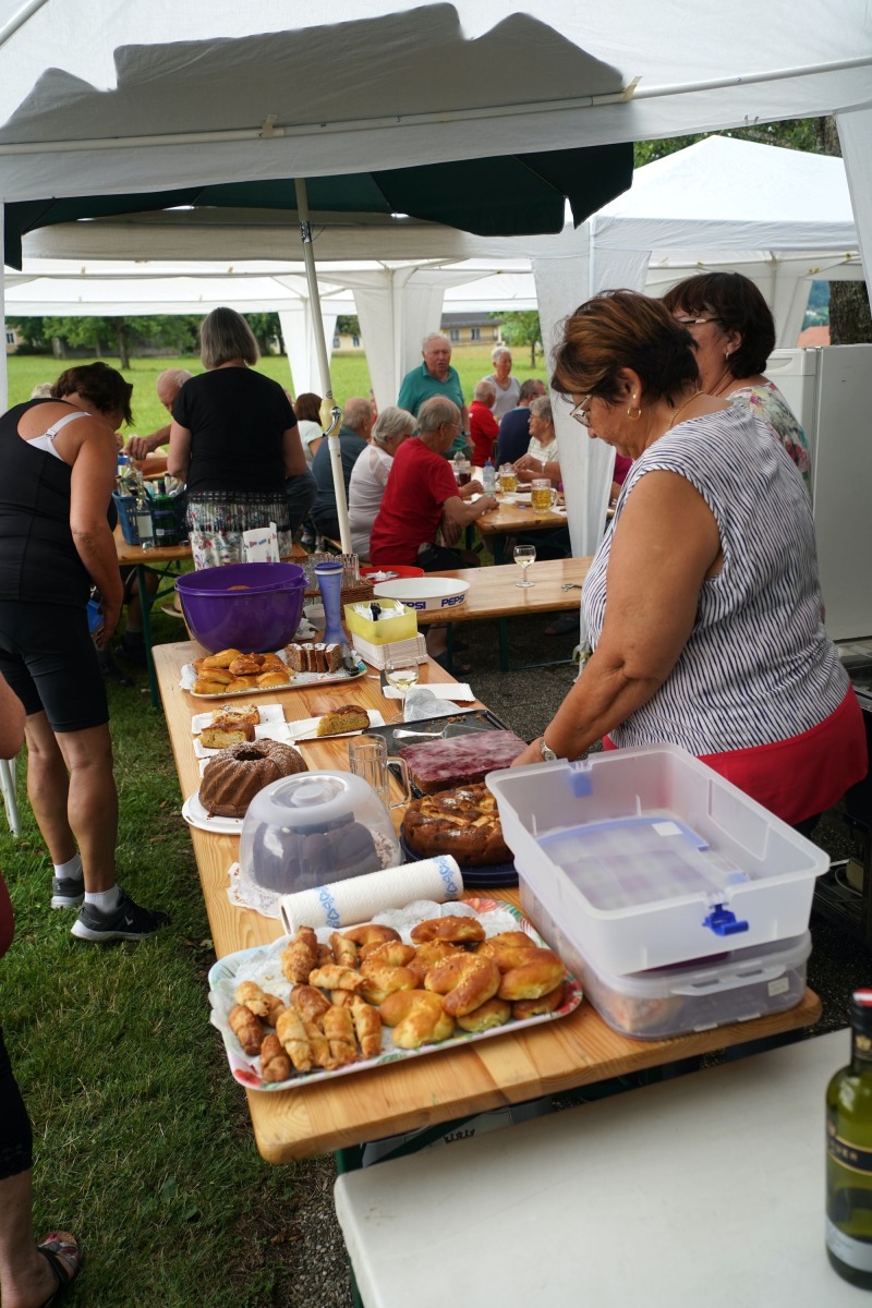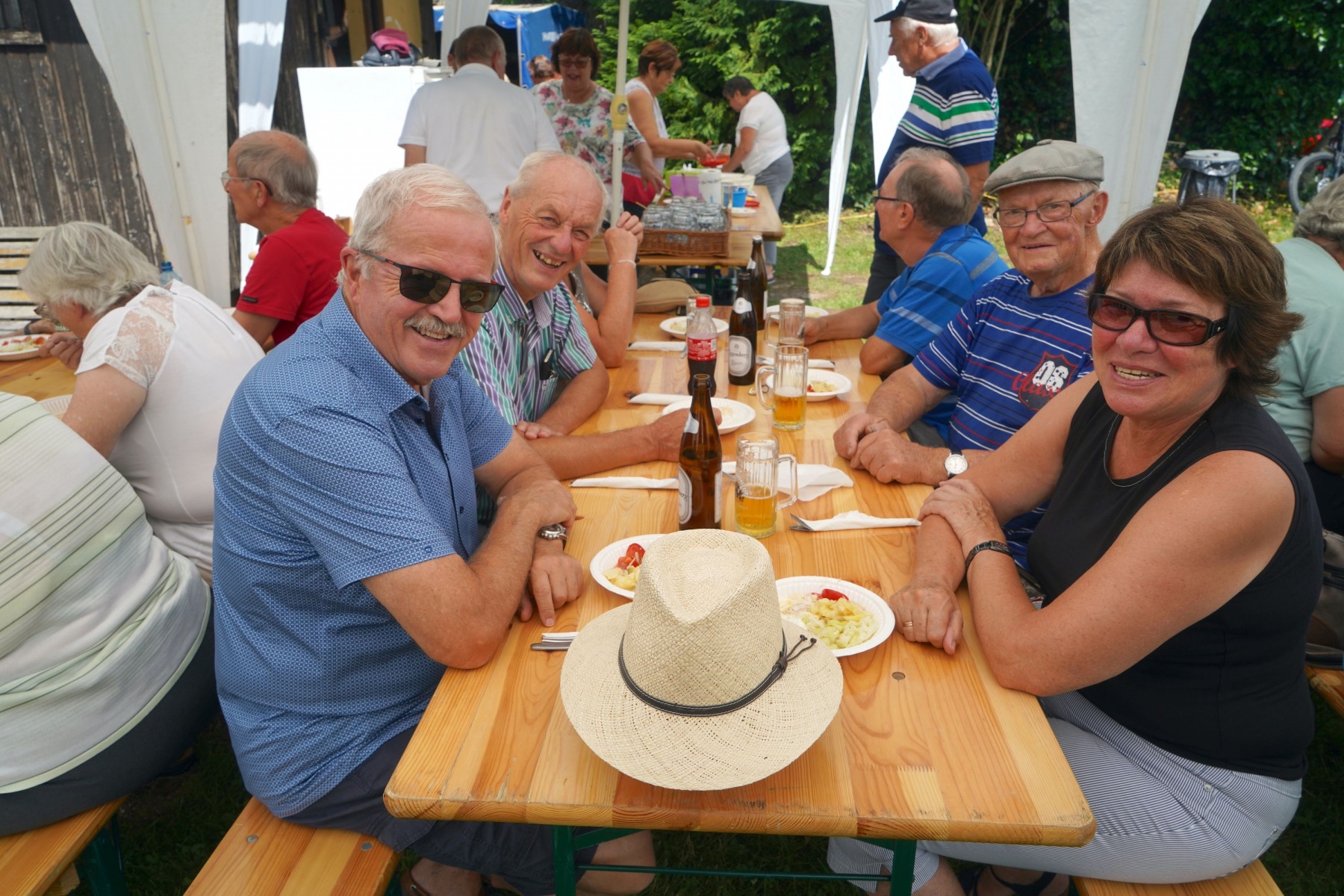 Um 11:30 Uhr trafen dann die geladenen Mitglieder nach und nach ein und schließlich waren es dann an die 70 Gäste, die sich prächtig unterhielten. Die Grillhenderl, zubereitet durch Reinhard AIGNER und Grillspezialitäten durch Karl VIECHTBAUER schmeckten wie immer köstlich und das Salat,- und Kuchenbuffet, dass die weiblichen Vorstandsmitglieder beisteuerten spielte alle Stückerl. Musikalisch spielte Walter mit der Gitarre und Peter mit der Steirischen auf und dazu wurde kräftig gesungen und applaudiert. Gegen 16:00 Uhr verdunkelte sich der Himmel und ein kurzes Gewitter mit Starkregen beendete für einen Großteil der Gäste abrupt den gemütlichen Nachmittag. Natürlich blieben aber „der harte Kern“ unter den Zelten sitzen und feierten fröhlich bis in den Abend hinein weiter.