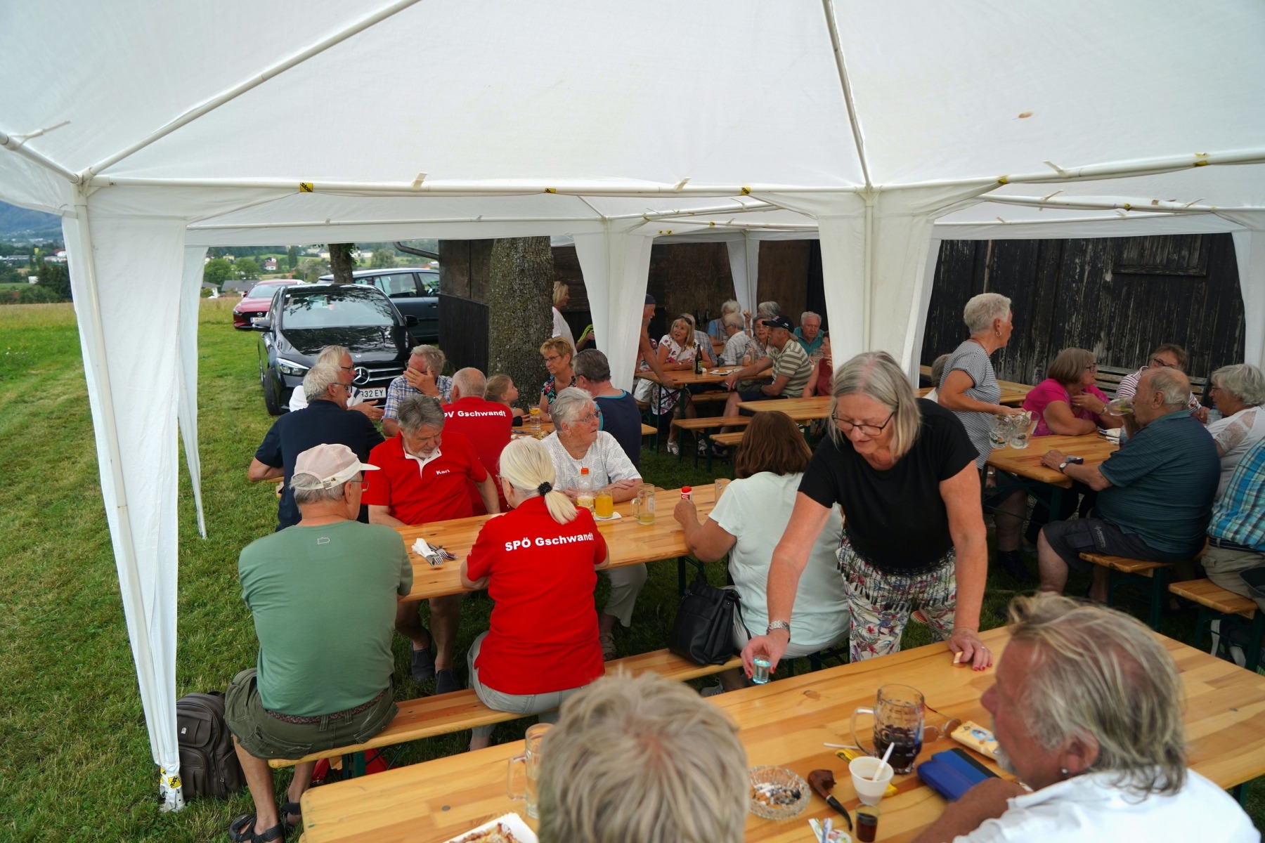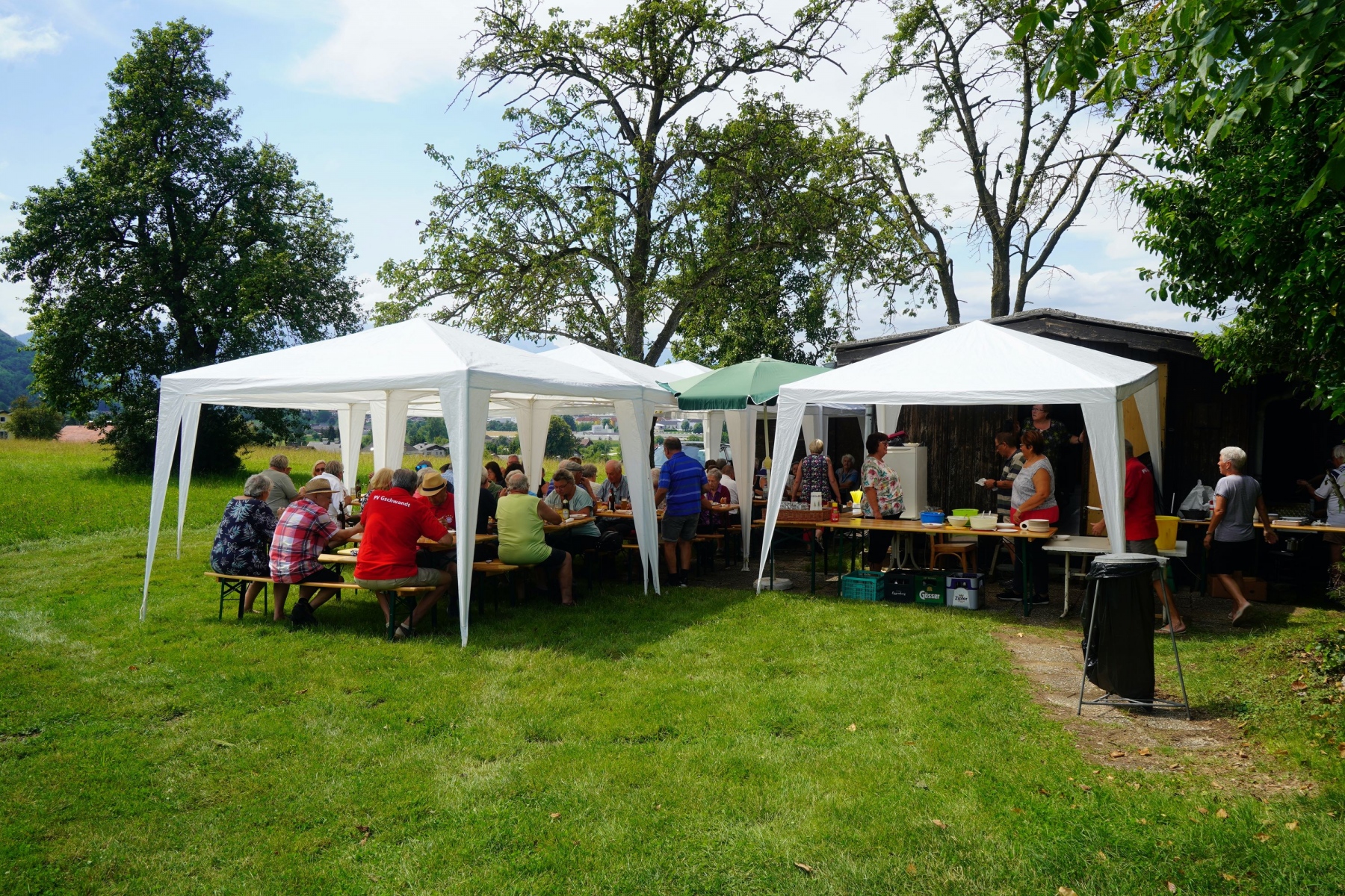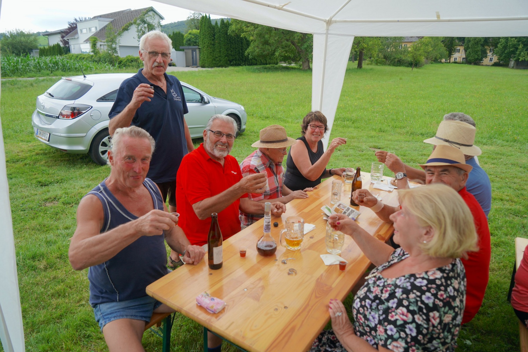 Es war eine lange Zeit, aber am 28.7.2021 war es dann so weit! Hurra heute feiern wir, die Vereinsleitung des Pensionistenverbandes Gschwandt unter Obmann Kurt VIERTBAUER lud alle Mitglieder zum „Grillfest in der Hütte“, quasi im Vereinsquartier in Baumgarten. Viele fleißige Hände stellten am frühen Vormittag Zelte und Tische auf, das Besteck wurde bereits auf den Tischen vorbereitet, Speisen und Getränke sind später auch serviert worden, um ein Gedränge bei der „Küche und Ausschank“ zu vermeiden. Auch wurde eine Liste der anwesenden Personen angelegt, um ev. Coronavorschriften udn Regeln gerecht zu werden.