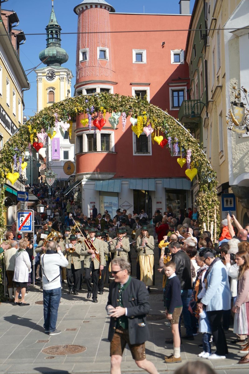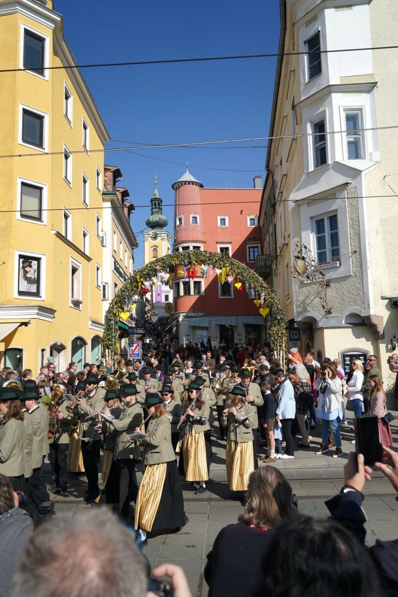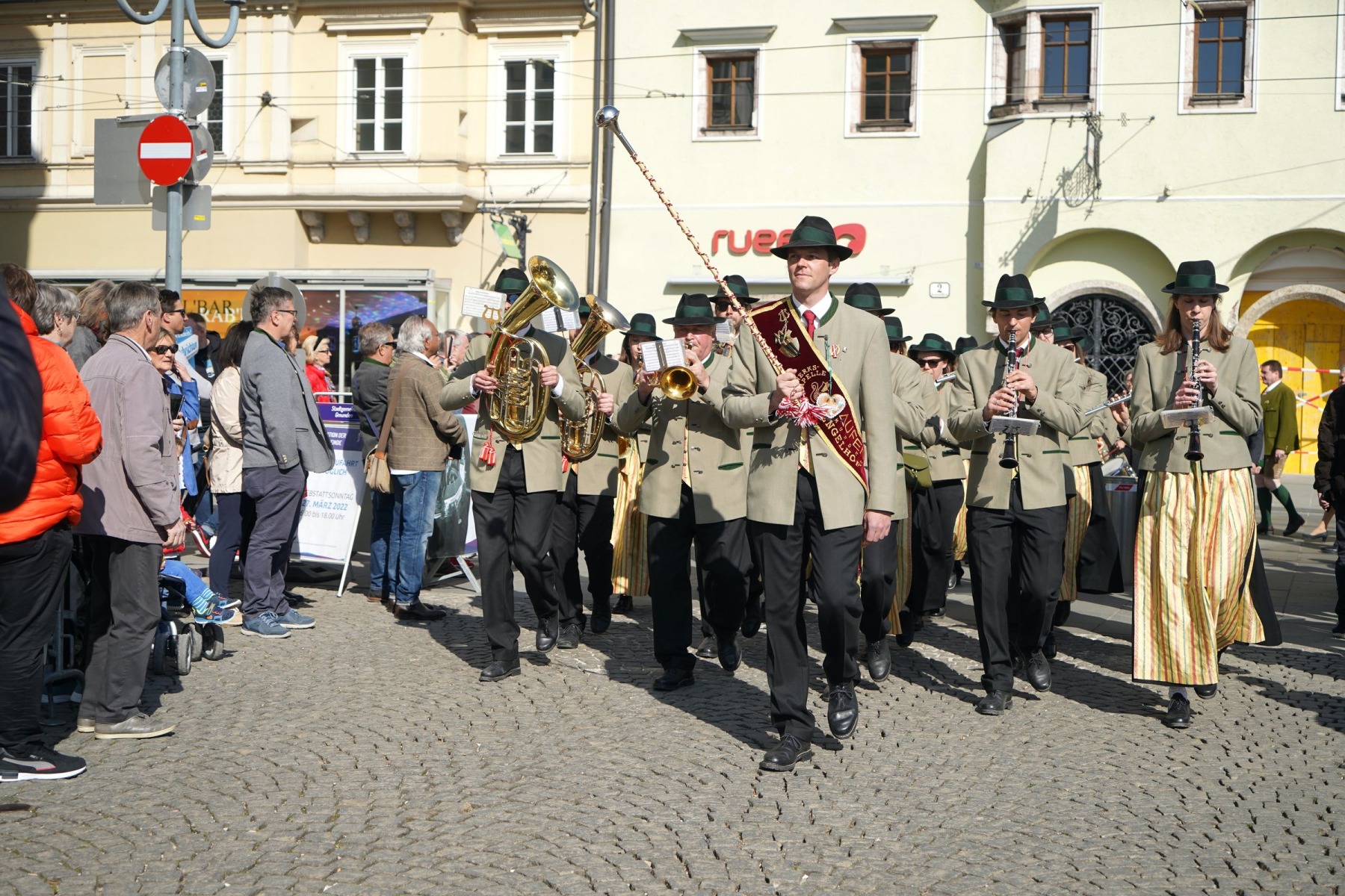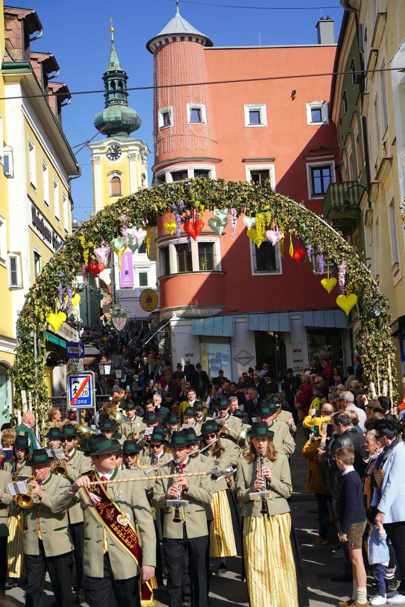 Wie auf Bestellung strahlte am heutigen Liebstattsonntag 27.3.2022 die Sonne vom Himmel und einer der wohl schönsten Brauchtumstage der Liebstattsonntag in Gmunden konnte stattfinden. Nach der Bauernmesse in der Pfarrkirche Gmunden marschierte der Festzug, angeführt von der Werkskapelle Lauffen Englhof über die Kirchengasse zum Rathausplatz Gmunden, wo bereits hunderte Besucher versammelt waren.