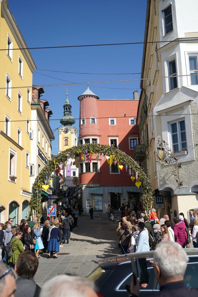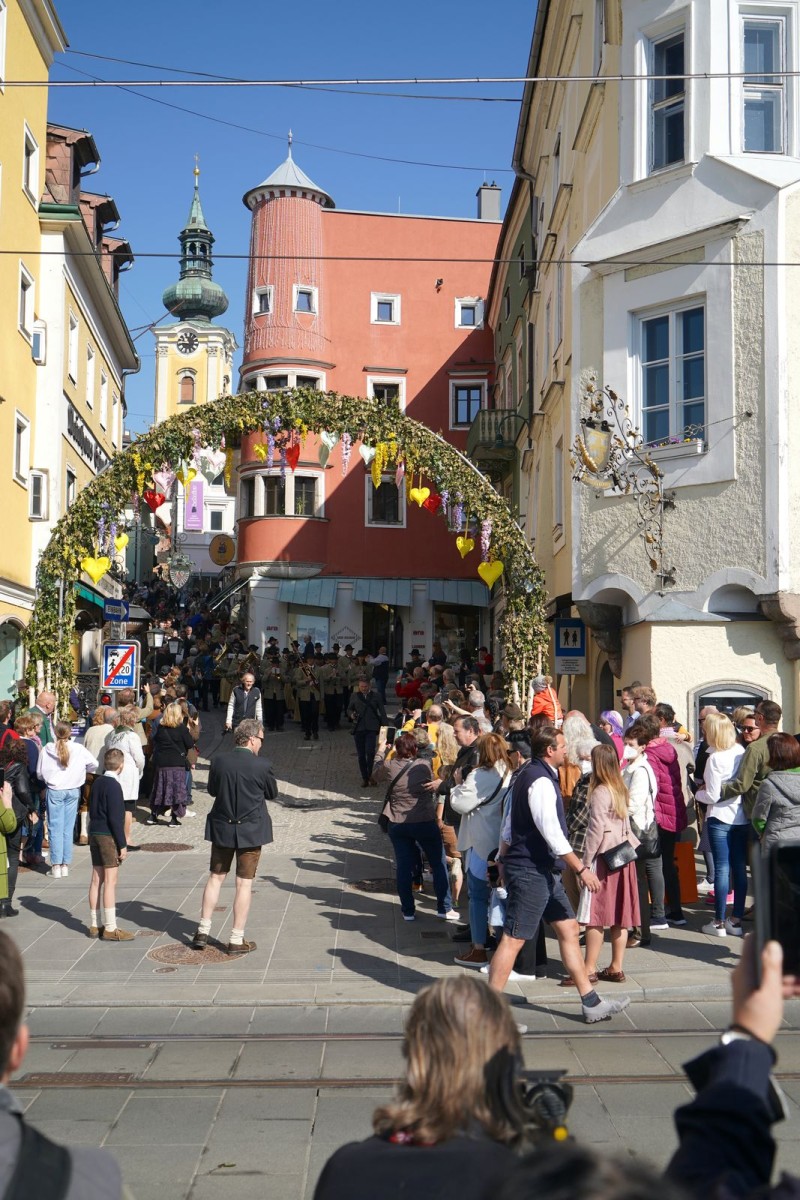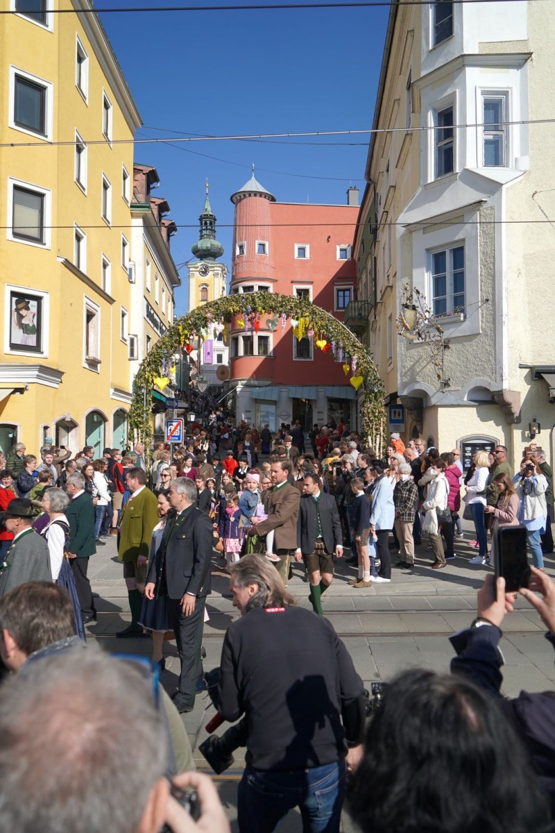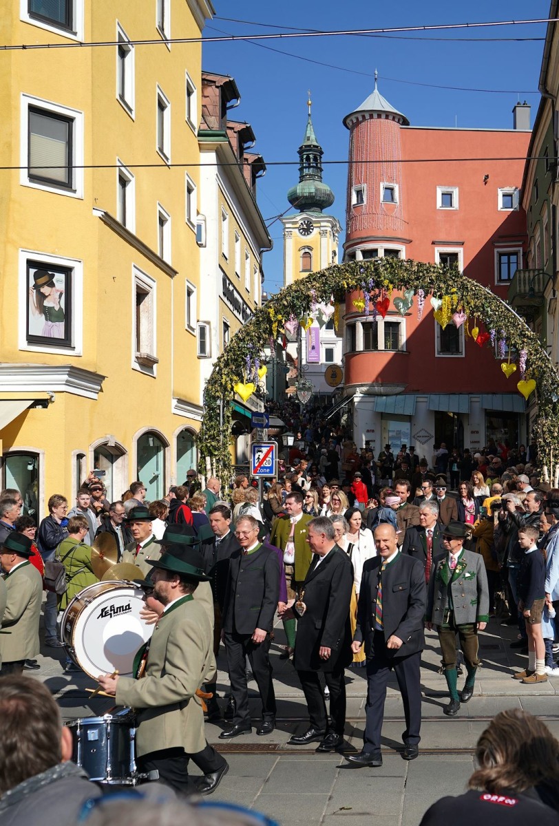Wie auf Bestellung strahlte am heutigen Liebstattsonntag 27.3.2022 die Sonne vom Himmel und einer der wohl schönsten Brauchtumstage der Liebstattsonntag in Gmunden konnte stattfinden. Nach der Bauernmesse in der Pfarrkirche Gmunden marschierte der Festzug, angeführt von der Werkskapelle Lauffen Englhof über die Kirchengasse zum Rathausplatz Gmunden, wo bereits hunderte Besucher versammelt waren.