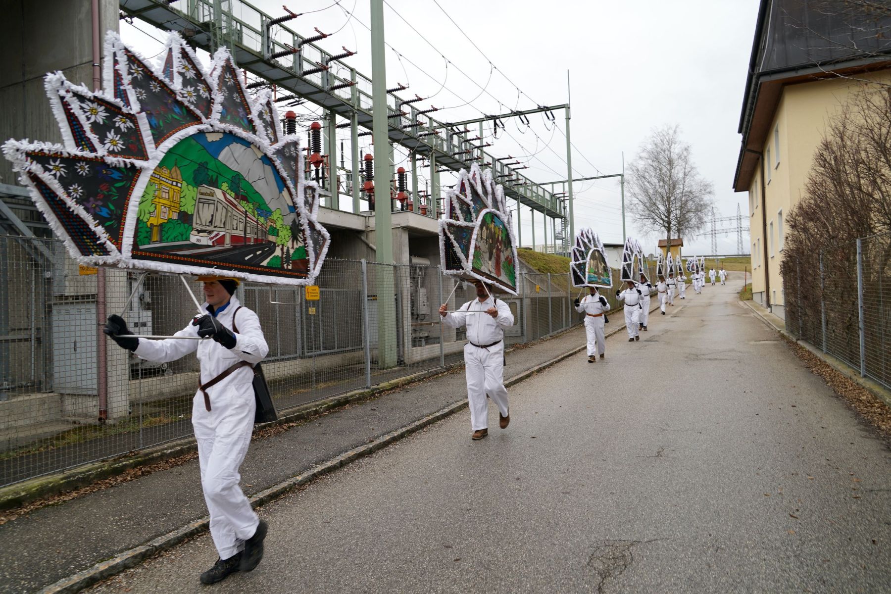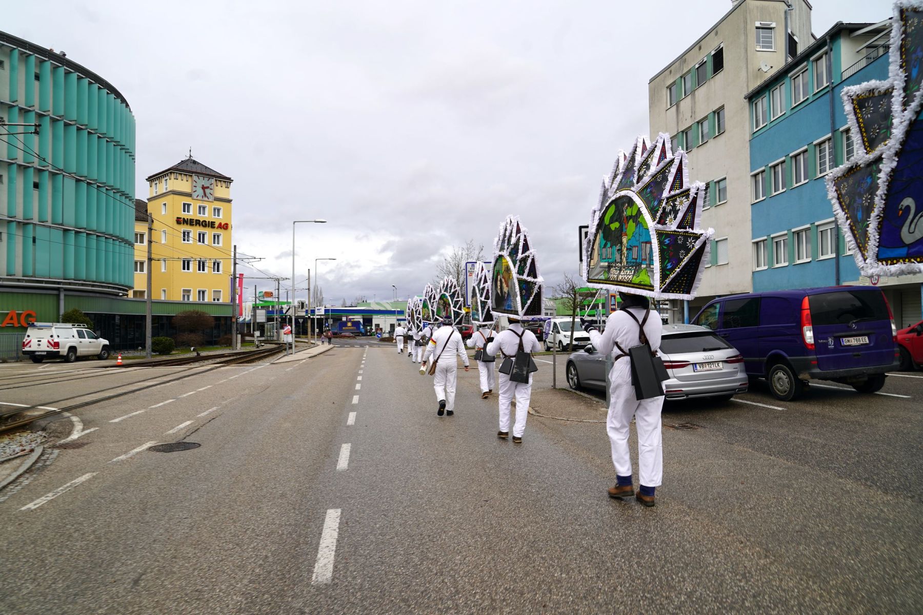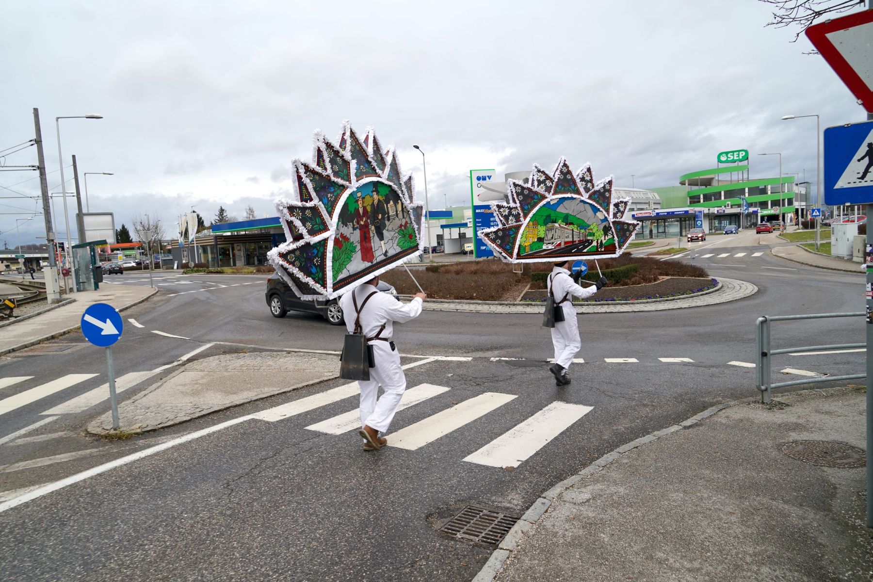 Regen setzte ein, Windböen brachte die Kappenträger an ihre Grenzen und nach wenigen 100 Meter mussten die Akteure einsehen, dass ein Weiterlaufen mit den großen Kappen eine große Gefahr darstellte. Eine Glöcklerkappe wurde zu diesem Zeitpunkt bei einer kräftigen Windböe bereits schwer beschädigt. Man war aber vorbereitet und hatte einen Klein-LKW der Firma REMAX bereits reserviert, da Philip STEINKOGLER ein Mitglied der TRAUNSTOANA dies angeboten hatte. Kurzer Hand wurden 9 Kappen in das Fahrzeug geladen und so von Station zu Station gefahren. Am Nachmittag legte sich zumindest der Wind und so konnte man auch mit den Kappen die Glöcklerbesuche durchführen. Die Freude bei diesen Stationen war Riesen groß, alle hatten die Hoffnung nicht aufgegeben und auch für Verköstigungen gesorgt. Höhepunkt des Tages war wie immer der große Glöcklerlauf am Rathausplatz Gmunden. Dort hatten sich hunderte Menschen trotz Regen versammelten und warteten gespannt auf den Einlauf der Glöcklerpassen. Ein wunderschöner Brauch, der nach zwei Jahren Corona bedingter Pause doch stattfinden konnte.