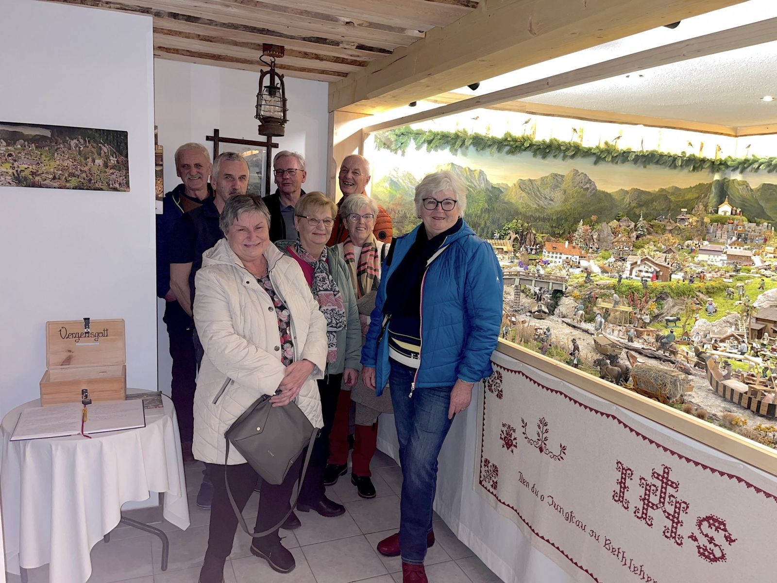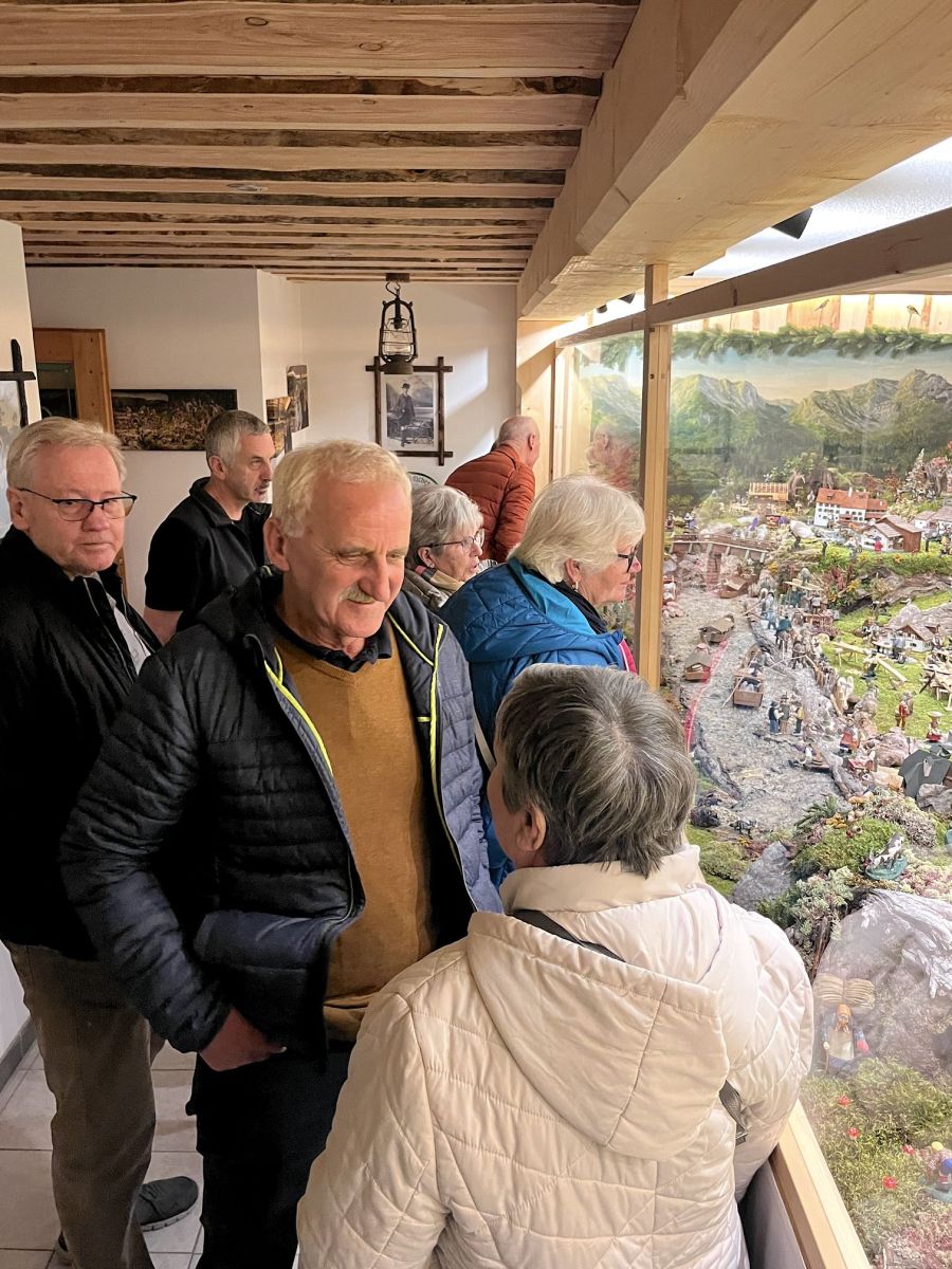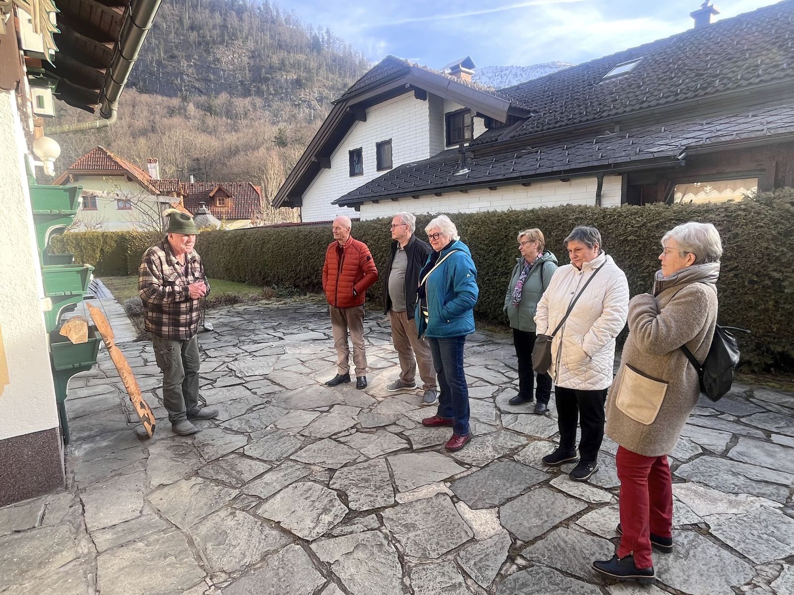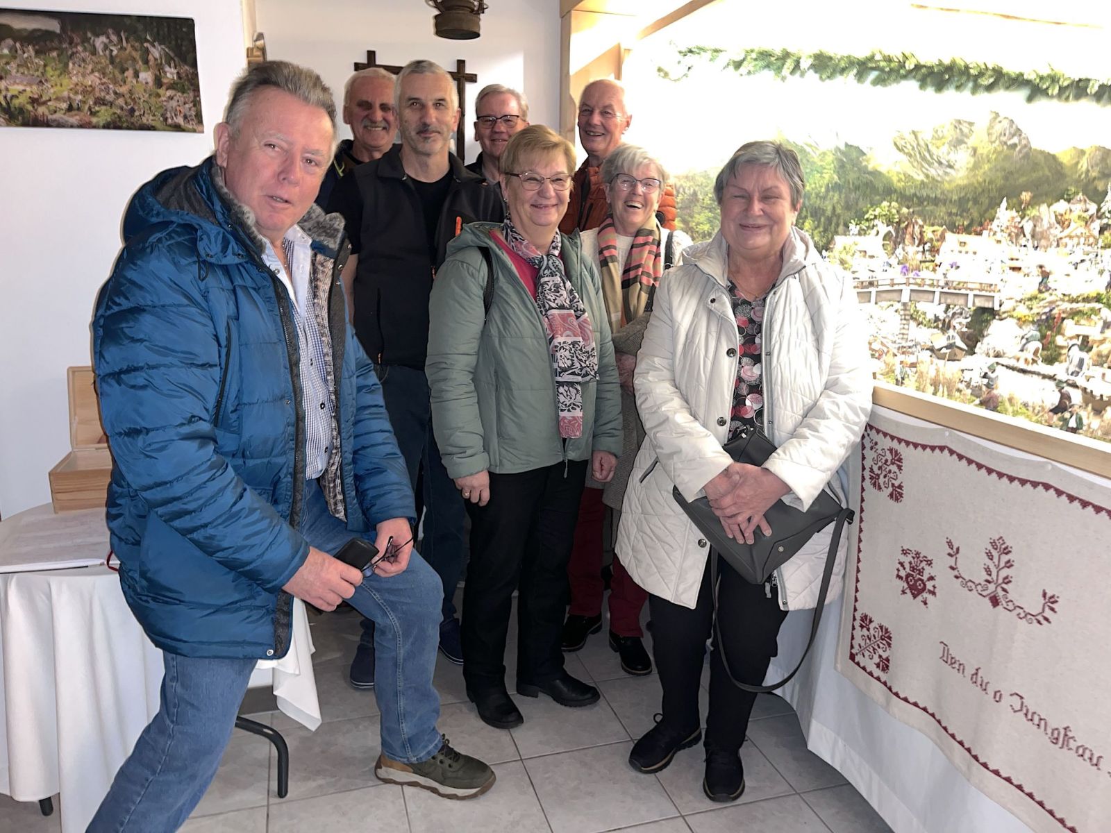Noch war es möglich des Krippöschaun in Ebensee. Und das nützten wir am Montag 27.1.2025. Unsere acht köpfige Gruppe machte sich auf den Weg, der uns als erste Station zur Familie Franz Stüger vulgo Ka°librenner Krippe in der Heisslfeldsiedlung führte. Franz Stüger begrüßte uns recht herzlich und führte uns in Richtung seiner Krippe. Im Vorraum waren in liebevoll gestalteten Vitrinen Stationen rund um das Krippengeschehen aufgebaut und dann öffnete sich die Tür zur wohl größten Krippe des Salzkammergutes. Unbeschreiblich was da der Krippenvater in mühevoller Kleinarbeit in 3-4 Wochen geschaffen hat. Ca 900 Figuren und Tiere haben in der Krippe Platz gefunden. Auch viele Häuser und Hütten des Salinenortes fanden ihren Platz und wurden uns von Franz namentlich genannt. Die typischen Figuren einer Salzkammergut Krippe incl. der Salzschiffer auf der Traun, der Arbeiter im Salzbergwerk, der Salinenkapelle, Holzfäller, Vogelfänger und und sind in der Krippe zu finden! Man könnte stundenlang schauen und findet immer wieder Neues. Nach dem Eintrag im Krippenbuch und einem guten Krippöschnapserl ging die Kripperlroas weiter.
