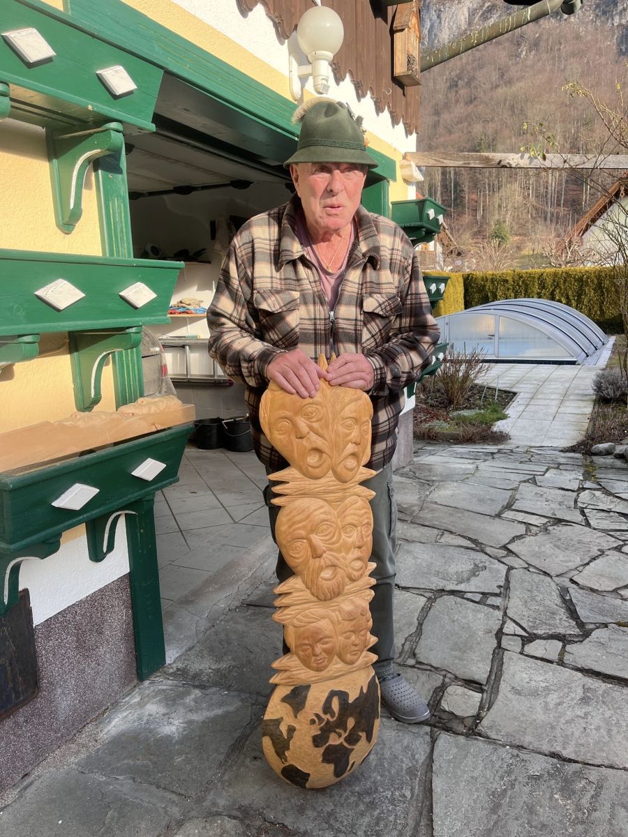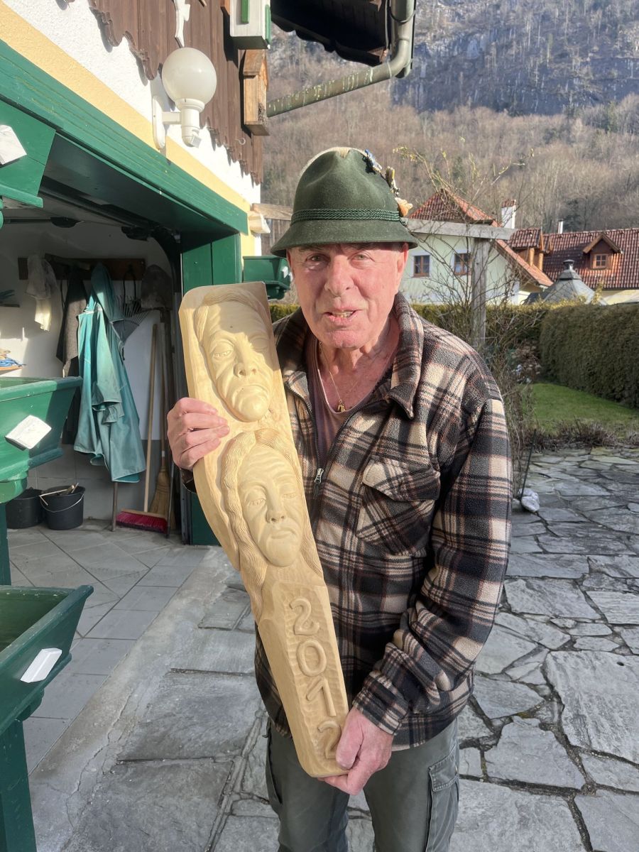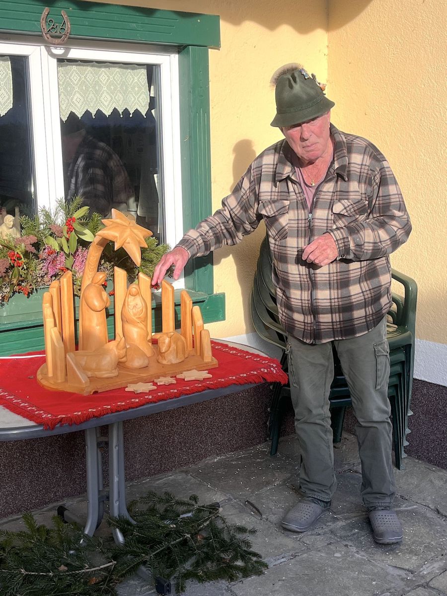 Nächste Station war bei Klaus Müllegger in Rindbach bei seinen herrlichen Blockkrippen. Klaus ist ein spätberufener Schnitzer, der erst mit 52 Jahre die Schnitzkunst erlernte und seither ausübt. Seine Spezialität ist das Schnitzen in Blockform. Ca 10 cm dicke Lindenblöcke werden mit Kettensäge grob bearbeitet und dann mit Schnitzmesser fein ausgearbeitet. Die fertigen Blöcke bekommen dann von einer Bekannten Malerin ihre farbliche Gestaltung und werden aneinander gereiht. Deshalb der Name Blockkrippen. Aber auch sonst gibt es verschiedene Kunstwerke wie Statuen und eine Darstellung des berühmten Ebenseer Fetzenzuges. Unwahrscheinlich was Klaus Müllegger da in seinen mehr als 30 Jahren Schnitzertätigkeit geschaffen hat. Mit einem herzlichen Dankeschön für seine ausführlichen Erklärungen ging die Roas weiter.