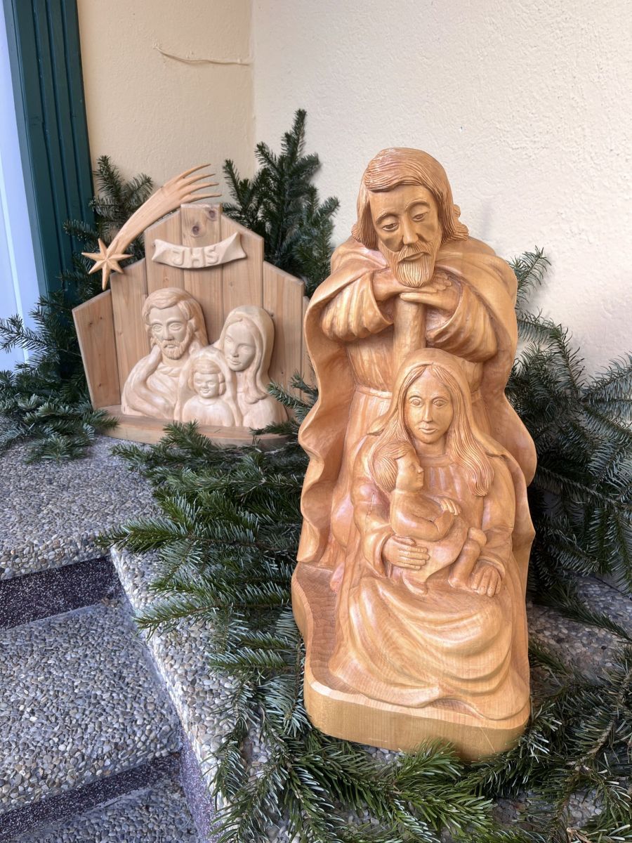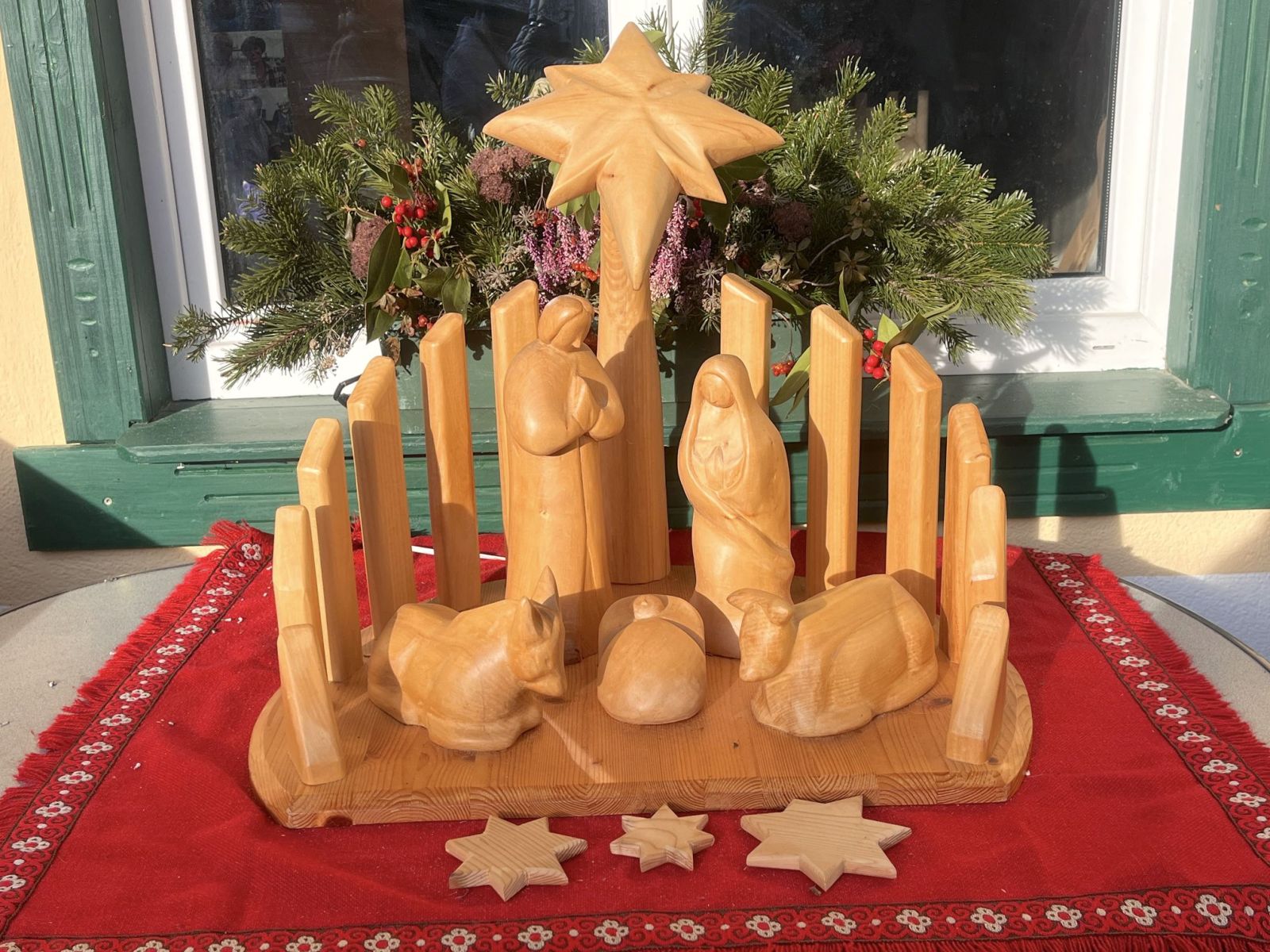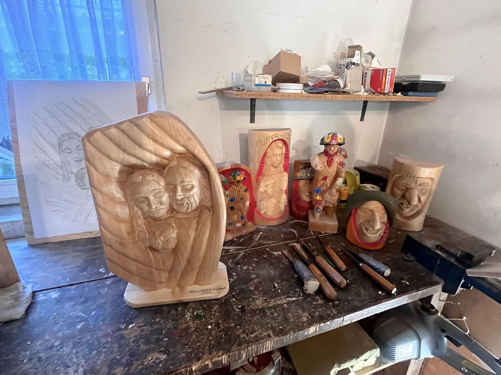 Nächste Station war bei Klaus Müllegger in Rindbach bei seinen herrlichen Blockkrippen. Klaus ist ein spätberufener Schnitzer, der erst mit 52 Jahre die Schnitzkunst erlernte und seither ausübt. Seine Spezialität ist das Schnitzen in Blockform. Ca 10 cm dicke Lindenblöcke werden mit Kettensäge grob bearbeitet und dann mit Schnitzmesser fein ausgearbeitet. Die fertigen Blöcke bekommen dann von einer Bekannten Malerin ihre farbliche Gestaltung und werden aneinander gereiht. Deshalb der Name Blockkrippen. Aber auch sonst gibt es verschiedene Kunstwerke wie Statuen und eine Darstellung des berühmten Ebenseer Fetzenzuges. Unwahrscheinlich was Klaus Müllegger da in seinen mehr als 30 Jahren Schnitzertätigkeit geschaffen hat. Mit einem herzlichen Dankeschön für seine ausführlichen Erklärungen ging die Roas weiter.