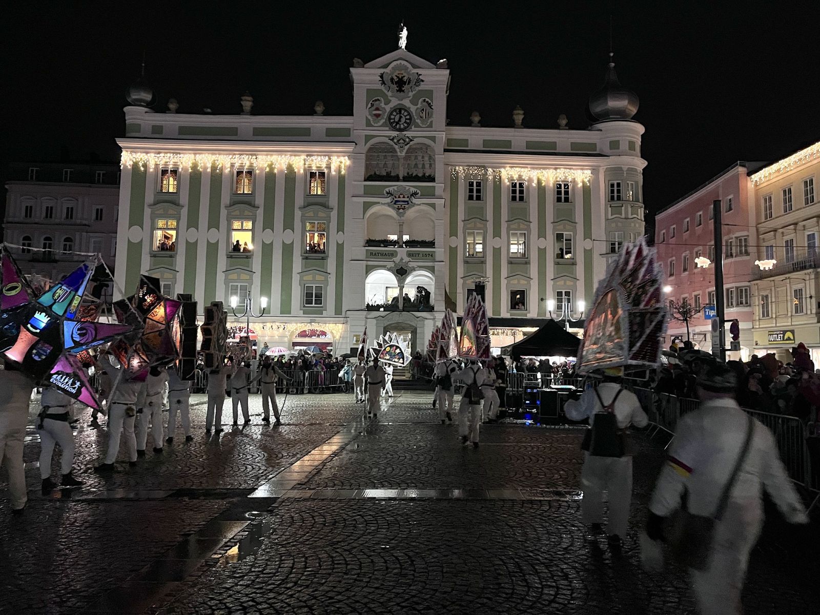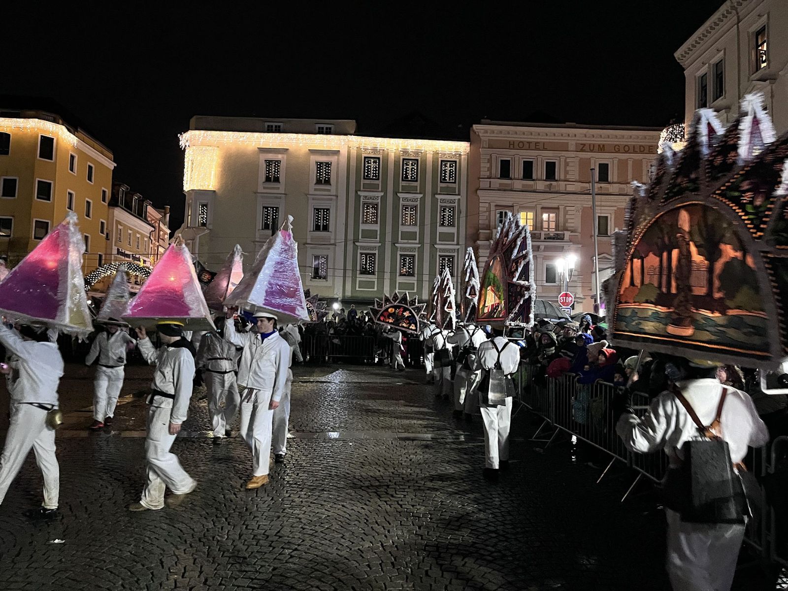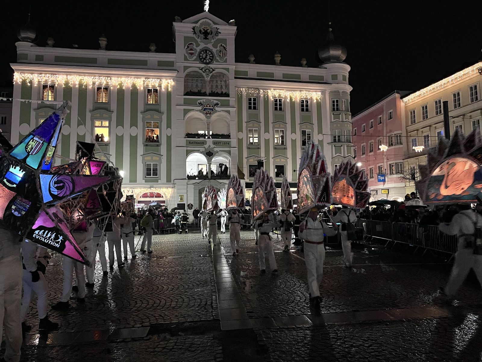 Regen setzte ein, Windböen brachte die Kappenträger an ihre Grenzen und nach wenigen 100 Meter mussten die Akteure einsehen, dass ein Weiterlaufen mit den großen Kappen eine große Gefahr darstellte. Eine Glöcklerkappe wurde zu diesem Zeitpunkt bei einer kräftigen Windböe bereits schwer beschädigt. Man war aber vorbereitet und hatte einen Klein-LKW der Firma REMAX bereits reserviert, da Philip STEINKOGLER ein Mitglied der TRAUNSTOANA dies angeboten hatte. Kurzer Hand wurden 9 Kappen in das Fahrzeug geladen und so von Station zu Station gefahren. Am Nachmittag legte sich zumindest der Wind und so konnte man auch mit den Kappen die Glöcklerbesuche durchführen. Die Freude bei diesen Stationen war Riesen groß, alle hatten die Hoffnung nicht aufgegeben und auch für Verköstigungen gesorgt. Höhepunkt des Tages war wie immer der große Glöcklerlauf am Rathausplatz Gmunden. Dort hatten sich hunderte Menschen trotz Regen versammelten und warteten gespannt auf den Einlauf der Glöcklerpassen. Ein wunderschöner Brauch, der nach zwei Jahren Corona bedingter Pause doch stattfinden konnte.