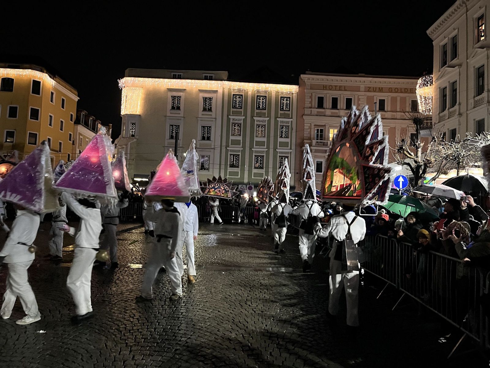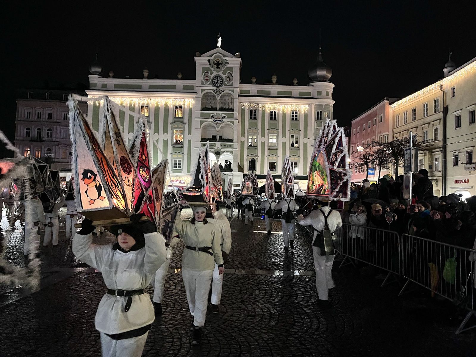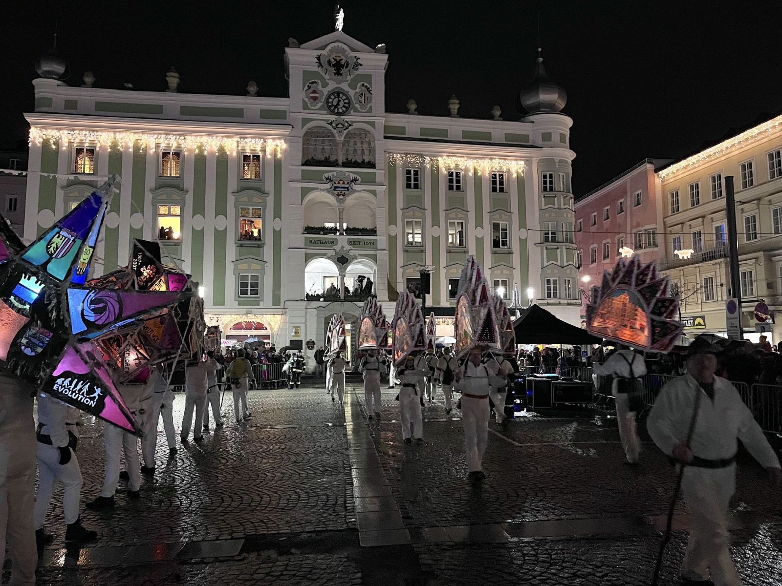 Regen setzte ein, Windböen brachte die Kappenträger an ihre Grenzen und nach wenigen 100 Meter mussten die Akteure einsehen, dass ein Weiterlaufen mit den großen Kappen eine große Gefahr darstellte. Eine Glöcklerkappe wurde zu diesem Zeitpunkt bei einer kräftigen Windböe bereits schwer beschädigt. Man war aber vorbereitet und hatte einen Klein-LKW der Firma REMAX bereits reserviert, da Philip STEINKOGLER ein Mitglied der TRAUNSTOANA dies angeboten hatte. Kurzer Hand wurden 9 Kappen in das Fahrzeug geladen und so von Station zu Station gefahren. Am Nachmittag legte sich zumindest der Wind und so konnte man auch mit den Kappen die Glöcklerbesuche durchführen. Die Freude bei diesen Stationen war Riesen groß, alle hatten die Hoffnung nicht aufgegeben und auch für Verköstigungen gesorgt. Höhepunkt des Tages war wie immer der große Glöcklerlauf am Rathausplatz Gmunden. Dort hatten sich hunderte Menschen trotz Regen versammelten und warteten gespannt auf den Einlauf der Glöcklerpassen. Ein wunderschöner Brauch, der nach zwei Jahren Corona bedingter Pause doch stattfinden konnte.