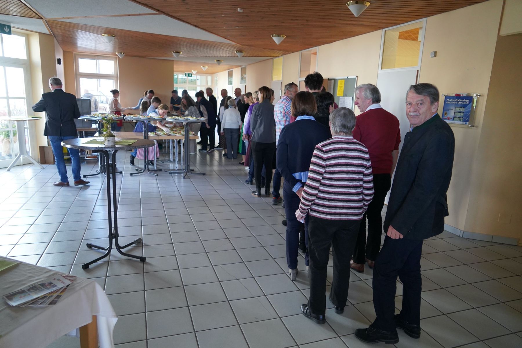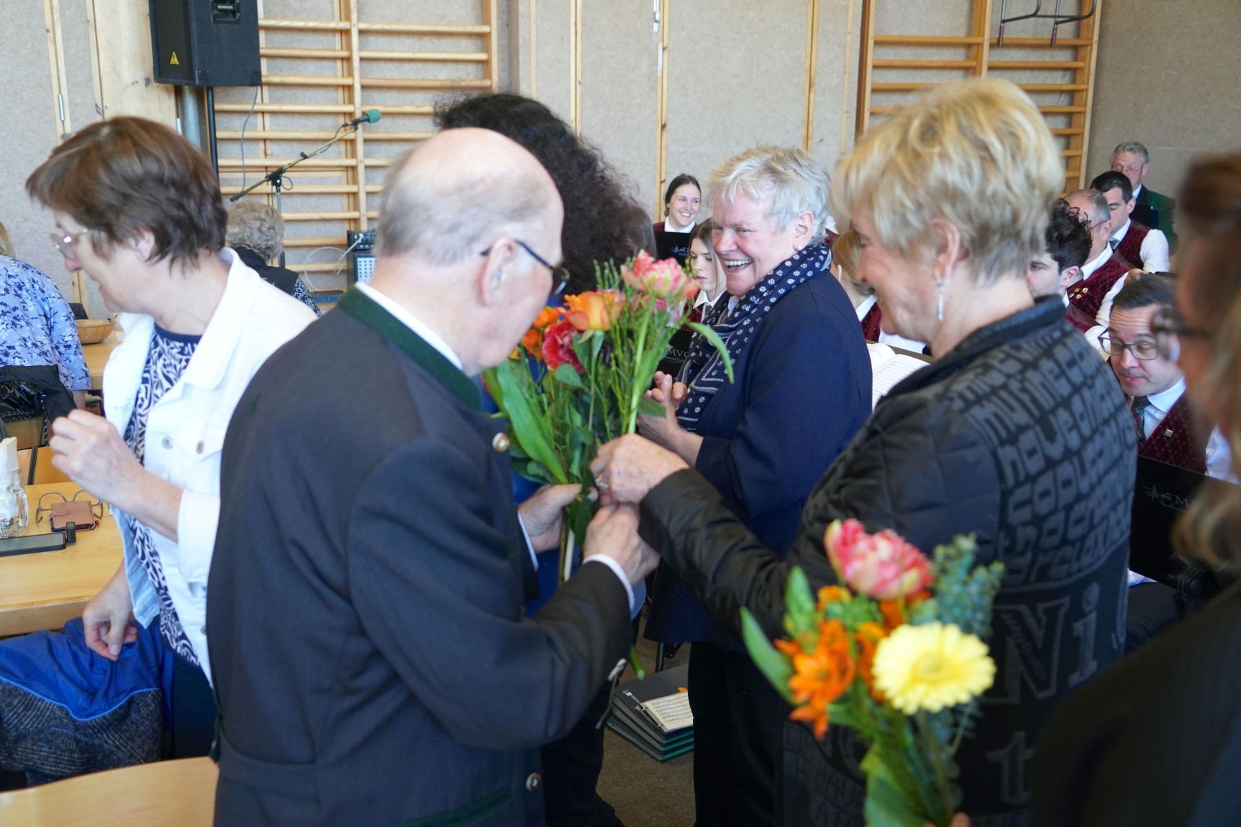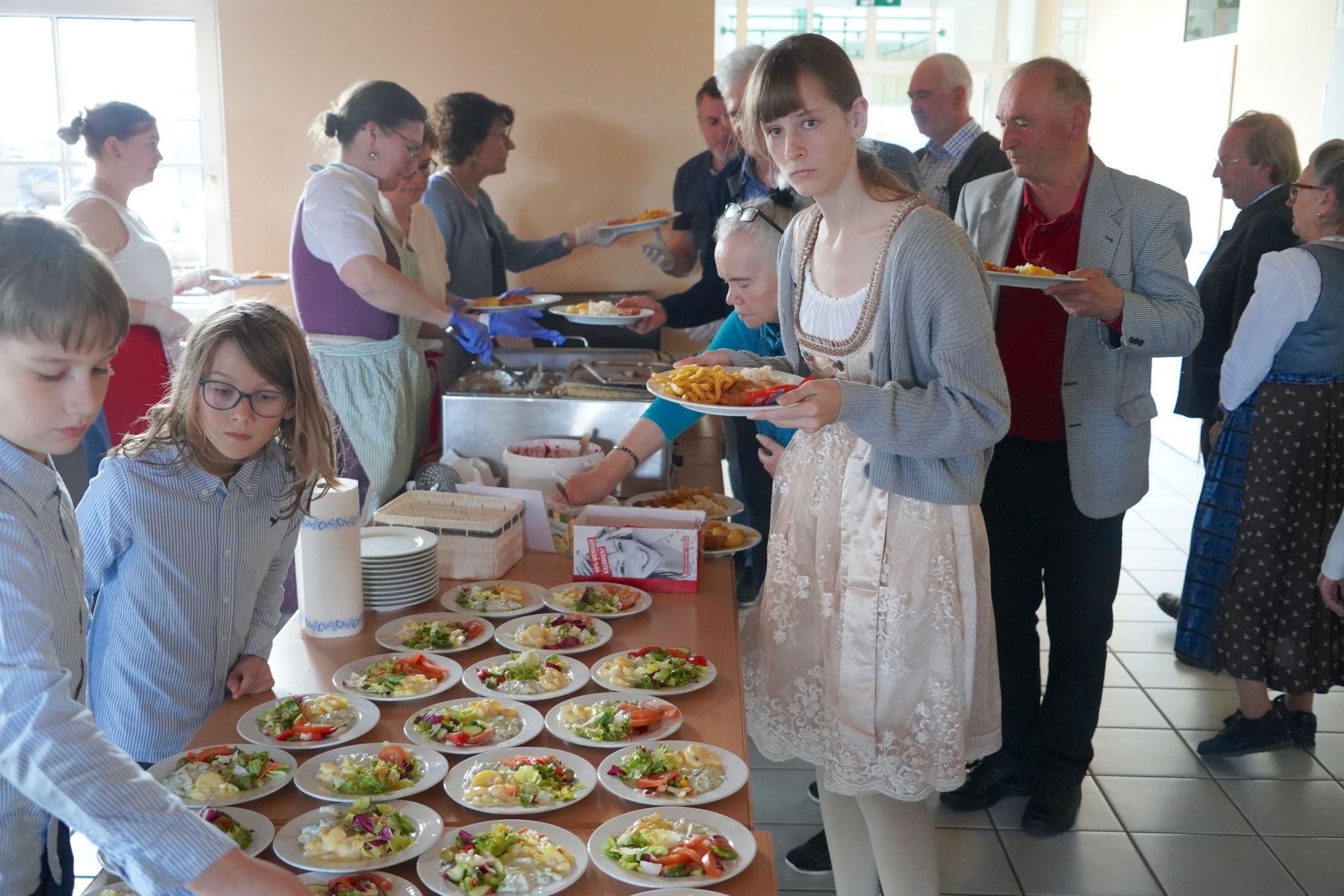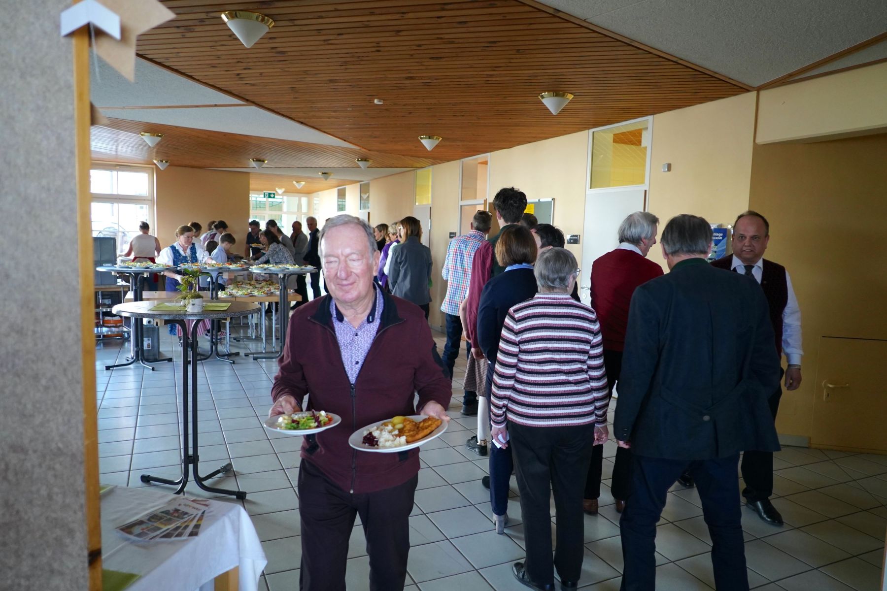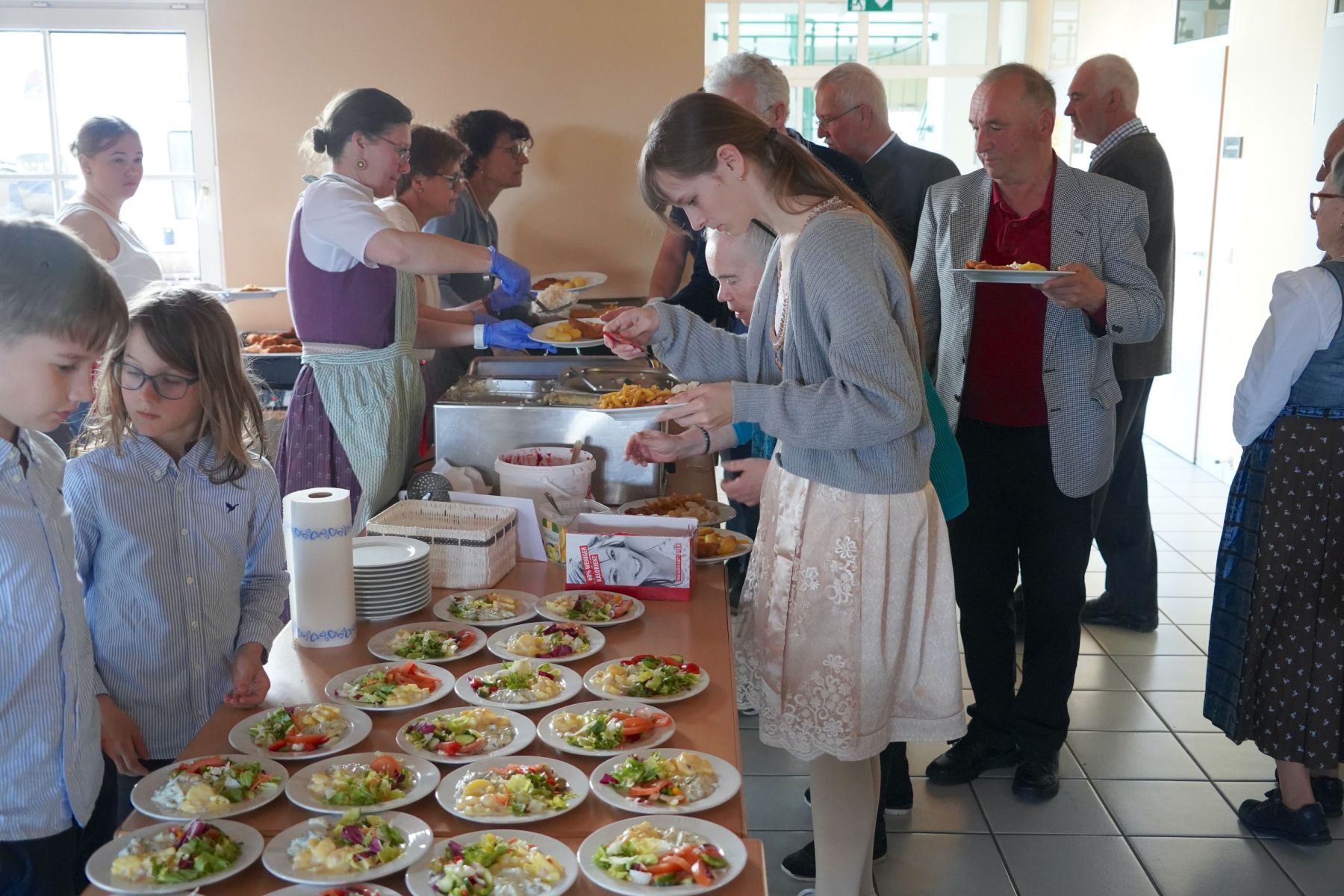 Nach der Messfeier zogen alle Kirchgänger mit dem Jubilar ALois Kainberger in die gegenüber liegende Mehrzweckhalle der Gemeinde Gschwandt. Dort war der Veranstaltungssaal bereits für das große Fest durch Mitarbeiter/innen der Pfarre Gschwandt und der Landjugend Gschwandt festlich vorbereitet und die Musikkapelle Gschwandt spielte beim Einzug der Festgäste auf. Anna-Maria Marschner ging mit Pfarrer Aloois Kainberger von Tisch zu Tisch zur persönlichen Begrüßung und Anstoßen auf das Jubelfest. Im Anschluss erfolgte der Festakt mit Ansprachen der Ehrengäste wie Bürgermeister Fritz Steindl mit Gattin und Pfarrer Mag. Franz Stallinger aus Laakirchen. Ein besonderes Gedicht folgte von Bernadett Hummer und Stefan Schimpl und Ursula Uhl brachten Anekdoten aus dem Leben von Alois Kainberger, das „Goscherl Ensemble“ spielte zwischendurch mit ihren Mundharmonika`s auf und Anna-Maria Marschner moderierte den Festakt. Natürlich wurde auch von Kapellmeister Lukas Lahninger der Taktstock an Alois Kainberger übergeben und alle Musiker folgten taktvoll dien Stockschwüngen von Hochwürden Alois!