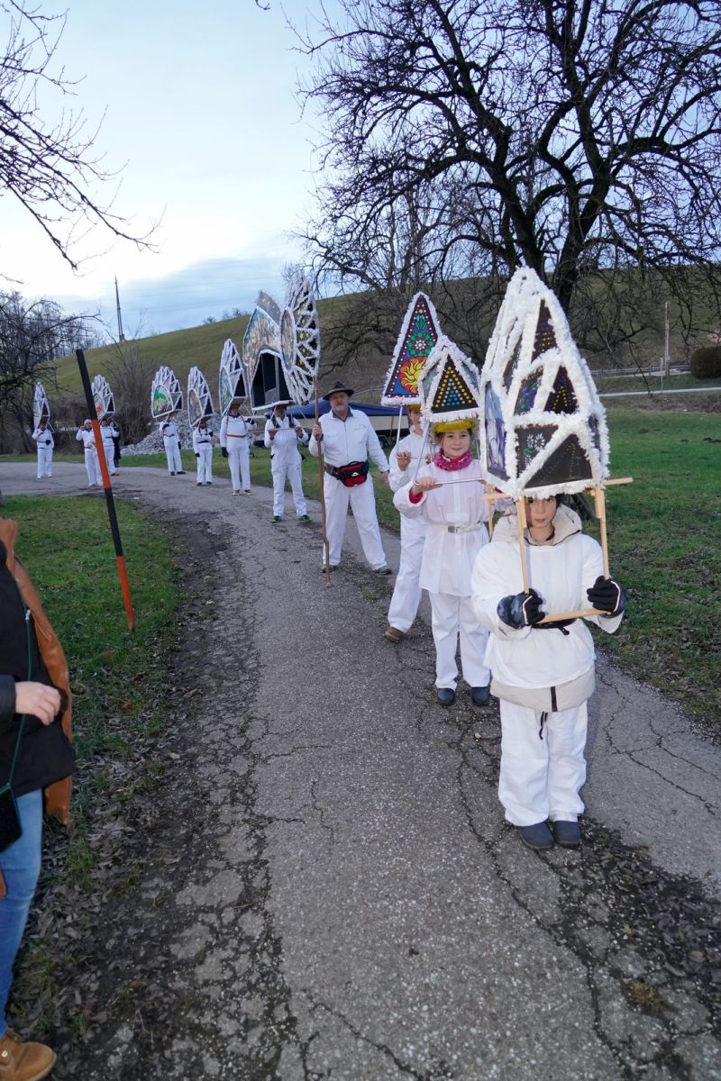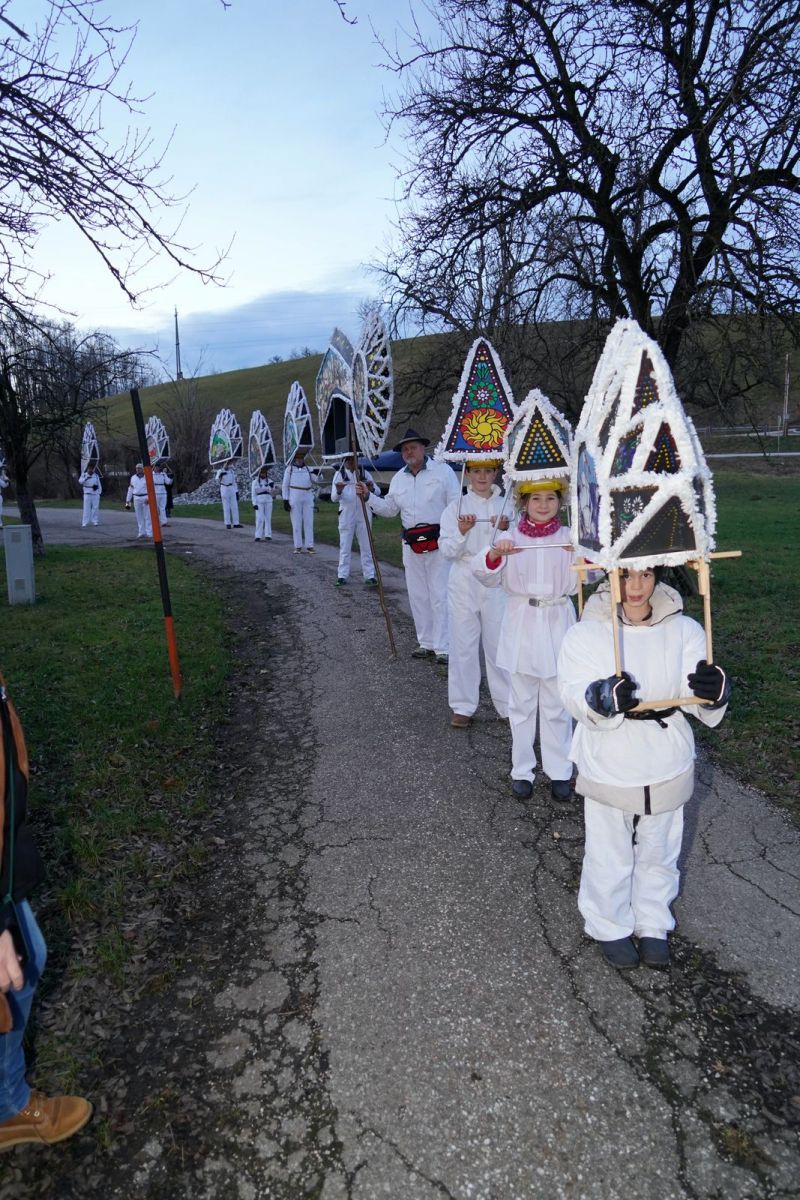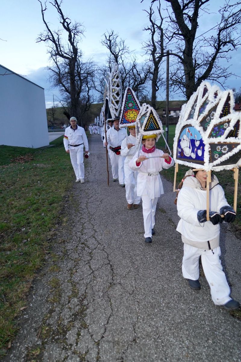 Weiter ging es der Esplanade entlang zum Esplanadencafe, zur Fam. Löberbauer, in den Einkaufspark SEP, wo die Traunstoana durch Sen. Chef Franz Moser persönlich empfangen wurden, dann zur Fam. Föttinger Fischill-Gut, Fam. Dickinger mit Nachbarn, wo auch die Kerzen in den Glöcklerkappen entzündet wurden und der Lauf zu Fam. Harringer „Seeholz“, einen der Höhepunkte des Tages, fortgesetzt wurde. Die weltbekannte „Glöcklersuppe“ hat wieder allen Teilnehmern hervorragend geschmeckt und gab genug Kraft für den weiten Weg in Richtung Rathausplatz Gmunden, wo der Glöcklerlauf in einem Riesen Spektakel mit ca 350 teilnehmenden Glöcklern endete. Eine schier unüberschaubare Menschenmenge empfang die Kappenträger mit tosendem Applaus. Nach einigen Runden am Rathausplatz sangen alle Teilnehmer gemeinsam die Glöcklerlieder „oh Wuna über Wuna“ und „es wird scho gleich dumpa“. Beim Auszug aus dem Rathausplatz verteilten Bgm Stefan Krapf und sein Vize Wolfgang Schlair die obligatorischen Glöcklerkrapfen an alle Kappenträger. Die Traunstoanapass blieb noch am Rathausplatz und alle interessierten Zuseher konnten einen Blick in und auf die kunstvollen Kappen werfen. Natürlich wurden auch viele Fragen zur Herstellung der Kappen und dem Glöcklerbrauch zufriedenstellend beantwortet.