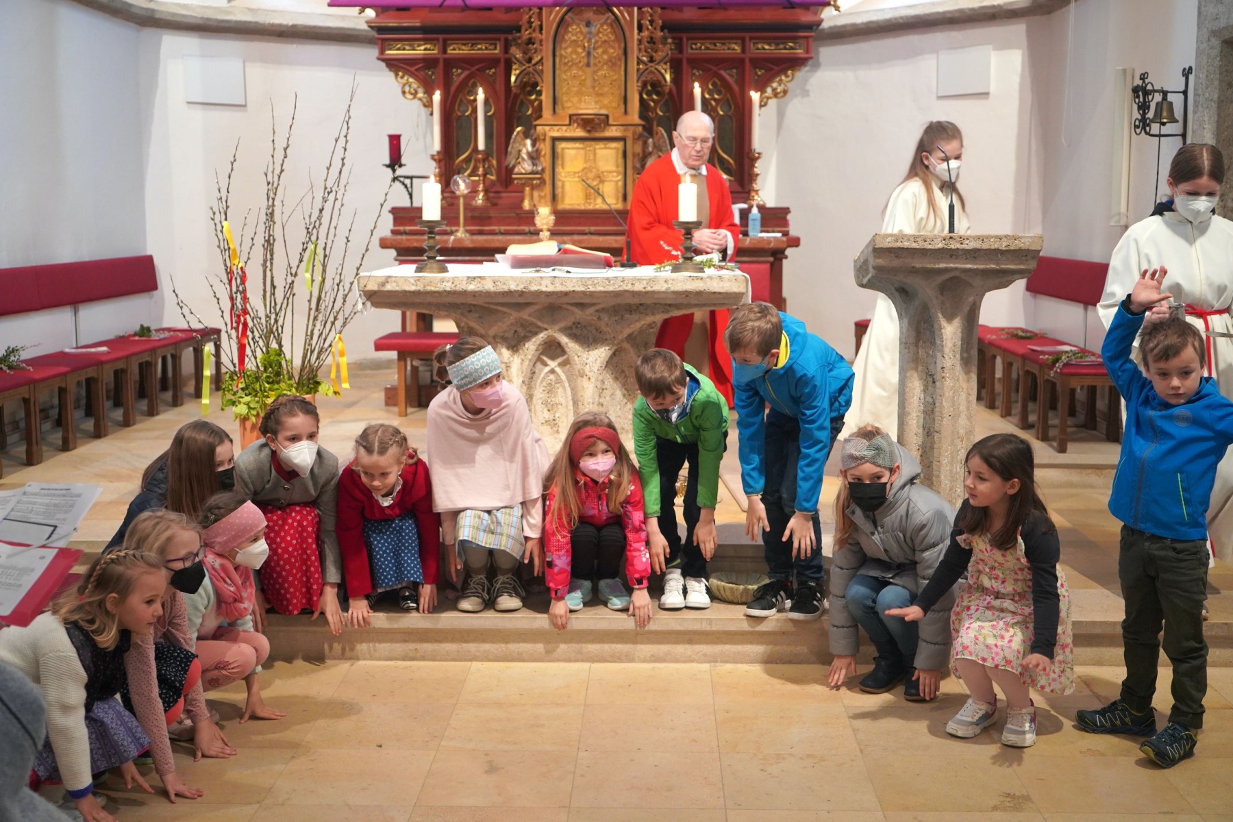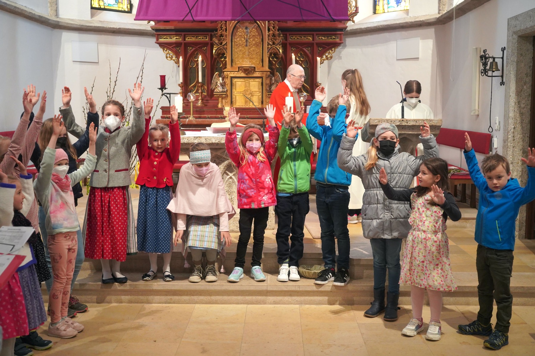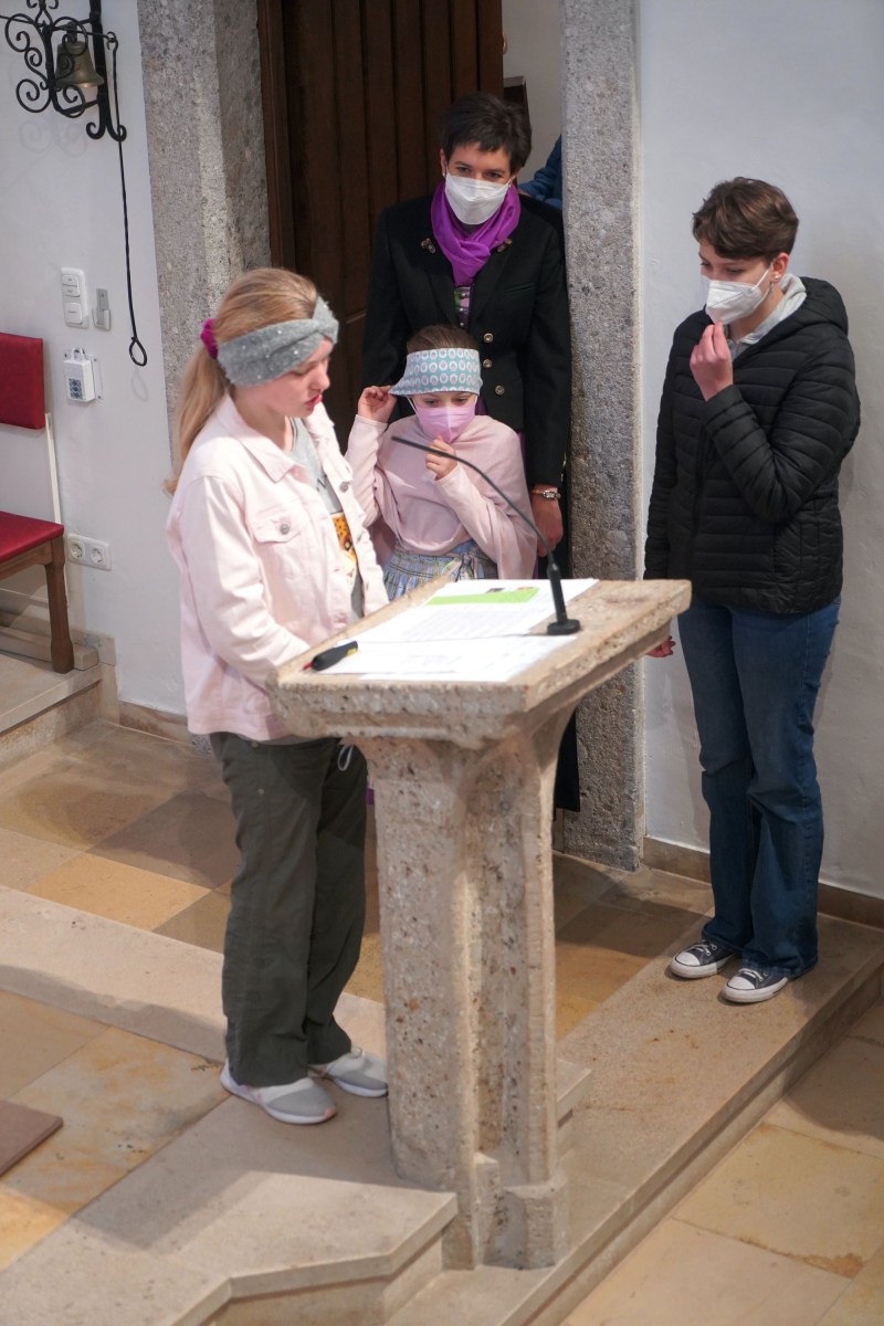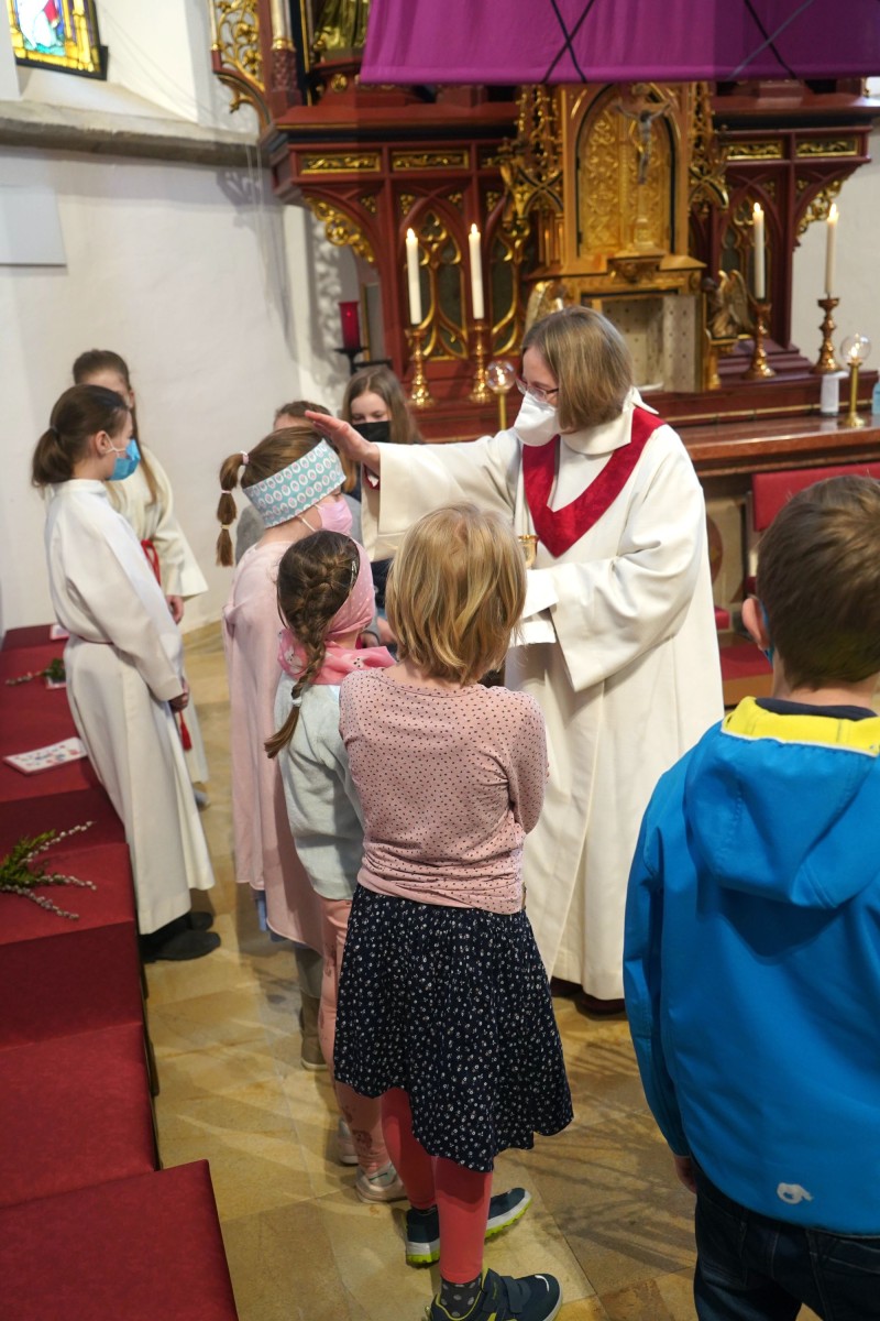 Der Wettergott hatte auch Einsehen und unterbrach das Aprilwetter für die Feierstunde im Freien ohne Regen, Schnee und Graupelschauer. Bei der Gestaltung der Messe im Inneren der Pfarrkirche wurden auch die Kinder und Jugendlichen einbezogen und auch der Leidensweg Jesus mit Bildbegleitung war etwas ganz besonderes. Einzig wohl auch das gesungene „Vater unser“ unter musikalischer Unterstützung der Musikkapelle Gschwandt. Am Ende des Gottesdienstes versammelten sich alle Kids und Jugendlichen mit Pfarrassistentin Anna Maria MARSCHNER und Pfarrer Alois KAINBERGER um den Altar zu einem Erinnerungsbild.