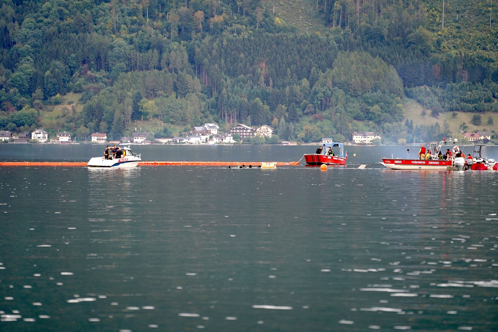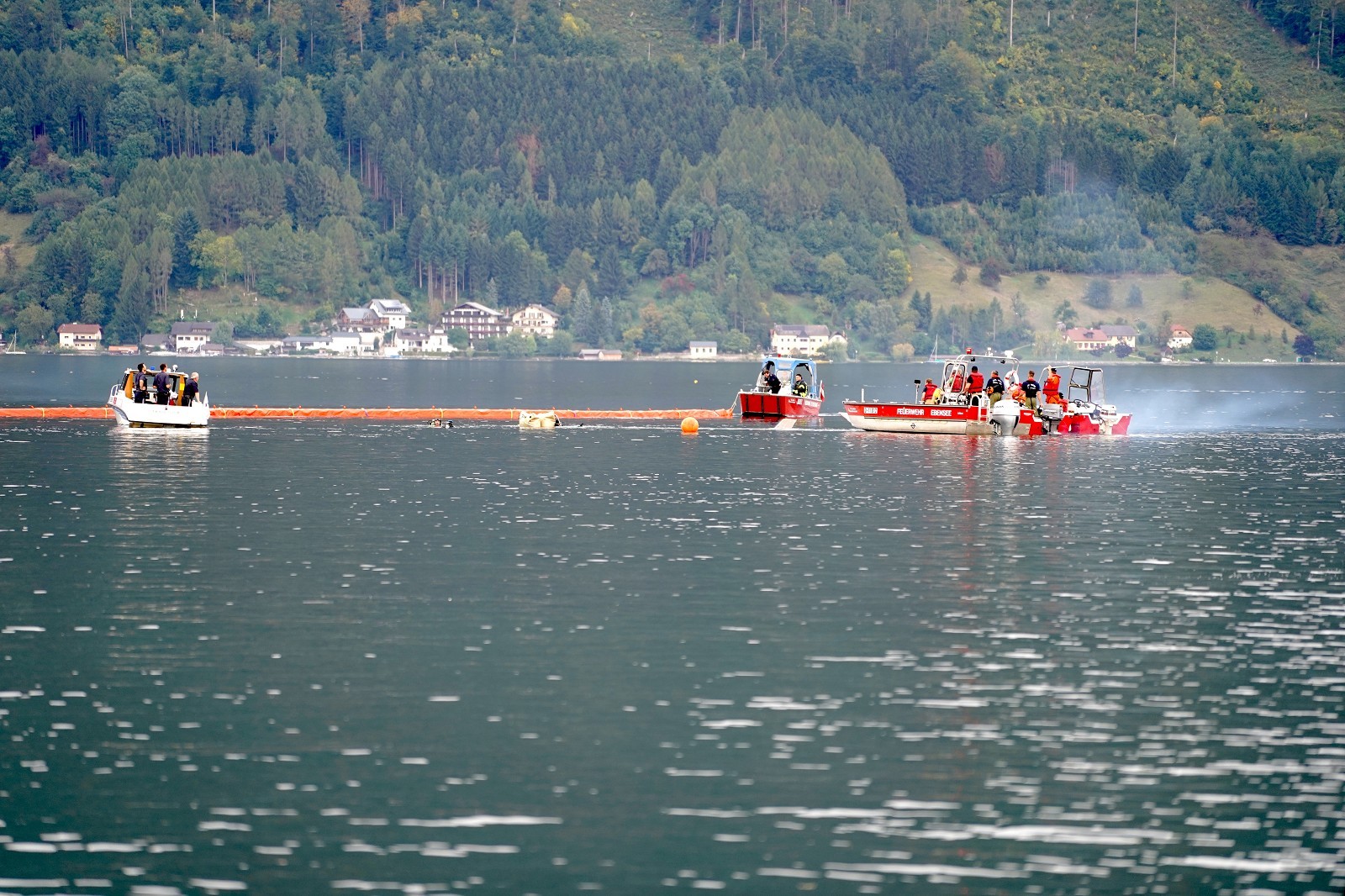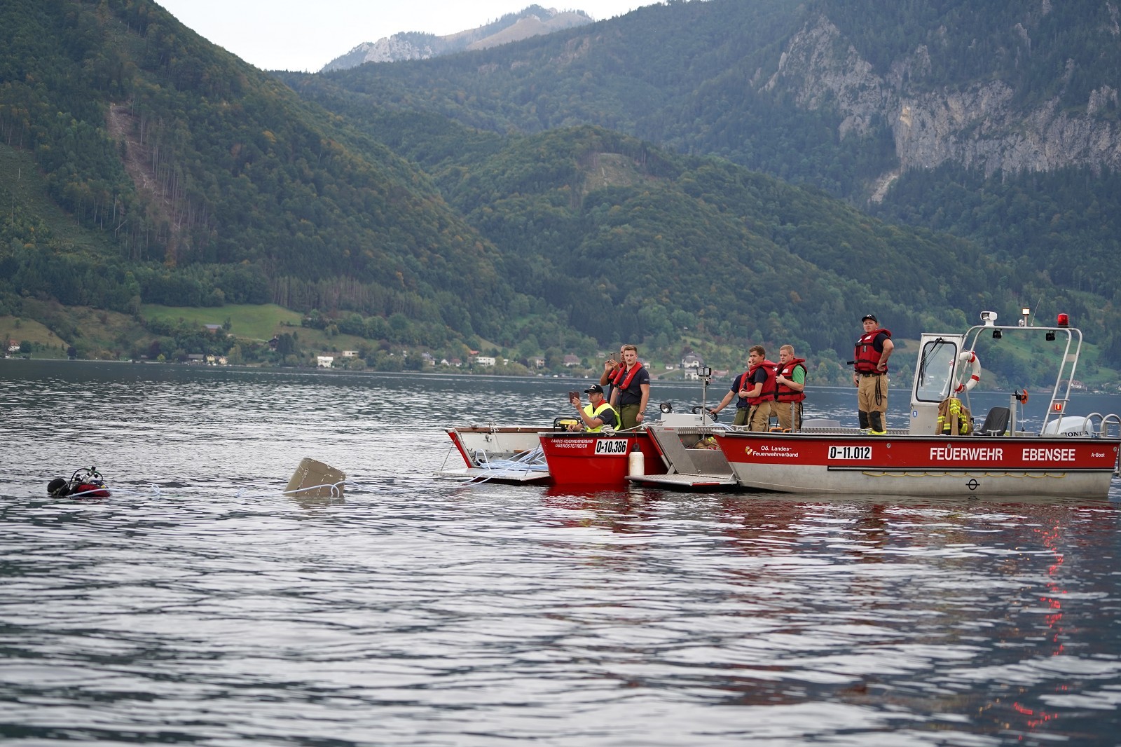 Nach wochenlanger, intensiver Planung durch die Feuerwehr Altmünster konnte heute diese Großübung in Angriff genommen werden. Schauplatz war die Seepromenade in Altmünster. Um ca 16 Uhr startete die FF Altmünster mit einem A-Boot und markierte nach Ortung die Unfallstelle mit einer Boje. Nach und nach trafen die Einsatzboote des Bezirkes an der Unfallstelle ein und wurden eingeteilt. Feuerwehrtaucher des Stützpunktes Traunkirchen machten den ersten Erkundungstauchgang und befreiten nach kurzer Zeit einen Insassen aus dem Hubschrauberwrack, der auch gleich an Land gebracht und dem Roten Kreuz übergeben wurde. Die Bergung der Maschine erwies sich als äußerst schwierig. Weitere Taucher wurden hinzugezogen, die dann an das Fluggerät Hebeballons anbrachten und so den Hubschrauber gleichmäßig an die Oberfläche beförderten.In der Zwischenzeit konnten auch die beiden vermissten Personen aus dem Ruderboot am Ufer ausgemacht und geborgen werden. Auch sie wurden dem roten Kreuz zur weiteren Betreuung übergeben.