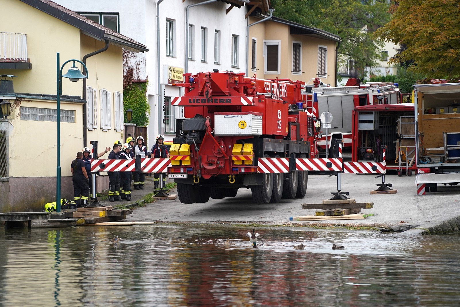 Der an die Wasseroberfläche gebrachten Hubschrauber wurde langsam mit zwei Arbeitsbooten in Richtung Ufer gezogen und mit dem schweren Kranfahrzeug der Feuerwehr Vöcklabruck aus dem Wasser gehoben und auf einen bereitstehenden Tieflader verfrachtet. Gegen 19:40 Uhr konnte dieses Übungsszenario erfolgreich abgeschlossen werden.Bei dieser Großübung waren 16 Feuerwehren mit 98 Feuerwehrkameraden mit insgesamt 32 Fahrzeugen, davon 11 Boote im Einsatz. Weiters die Wasserrettung mit 9 Mann und 3 Booten, das Rote Kreuz mit 5 Mann und 3 Fahrzeugen, die Polizei mit 6 Mann, einem Fahrzeug und einem Boot, die BH Gmunden mit einem Mann Rufbereitschaft und das Bundesheer mit einem Mann (von dort kam die von Linz zur Verfügung gestellte Hubschrauberzelle, bei der selbstverständlich keine Schadstoffe in den See gelangt sind, da Motor, Antrieb oder sonstige Teile, die Schmutz verursachen könnten, entfernt waren).