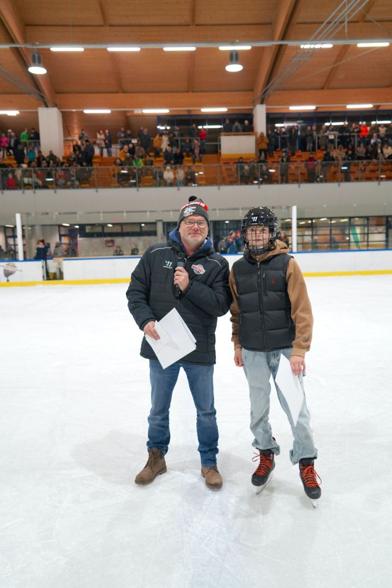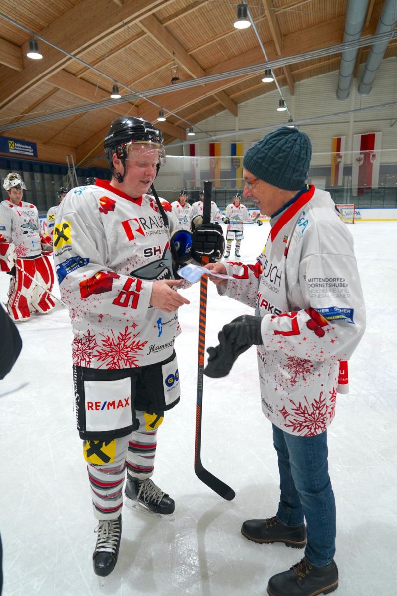 Der haushohe Gewinner des Abendswar aber Samuel, das RundschauChristkind. Nach Ende des Eishockeyspieles konnte den Eltern von Samuel durch Organisator Michael SCHALK und Sponsor Karl NEUMANN den gigantische Scheck aus dem Reinerlös des Benefizspieles in der Höhe von sage und schreibe 15.000,- Euro übergeben werden. Standing Ovation auf den Rängen, tosender Applaus aller Spieler und Beteiligten und die Rührung in dieser Situation war allen ins Gesicht geschrieben.
