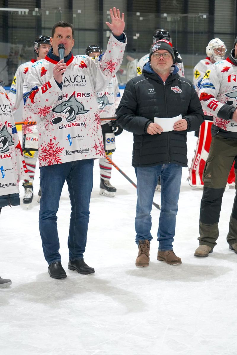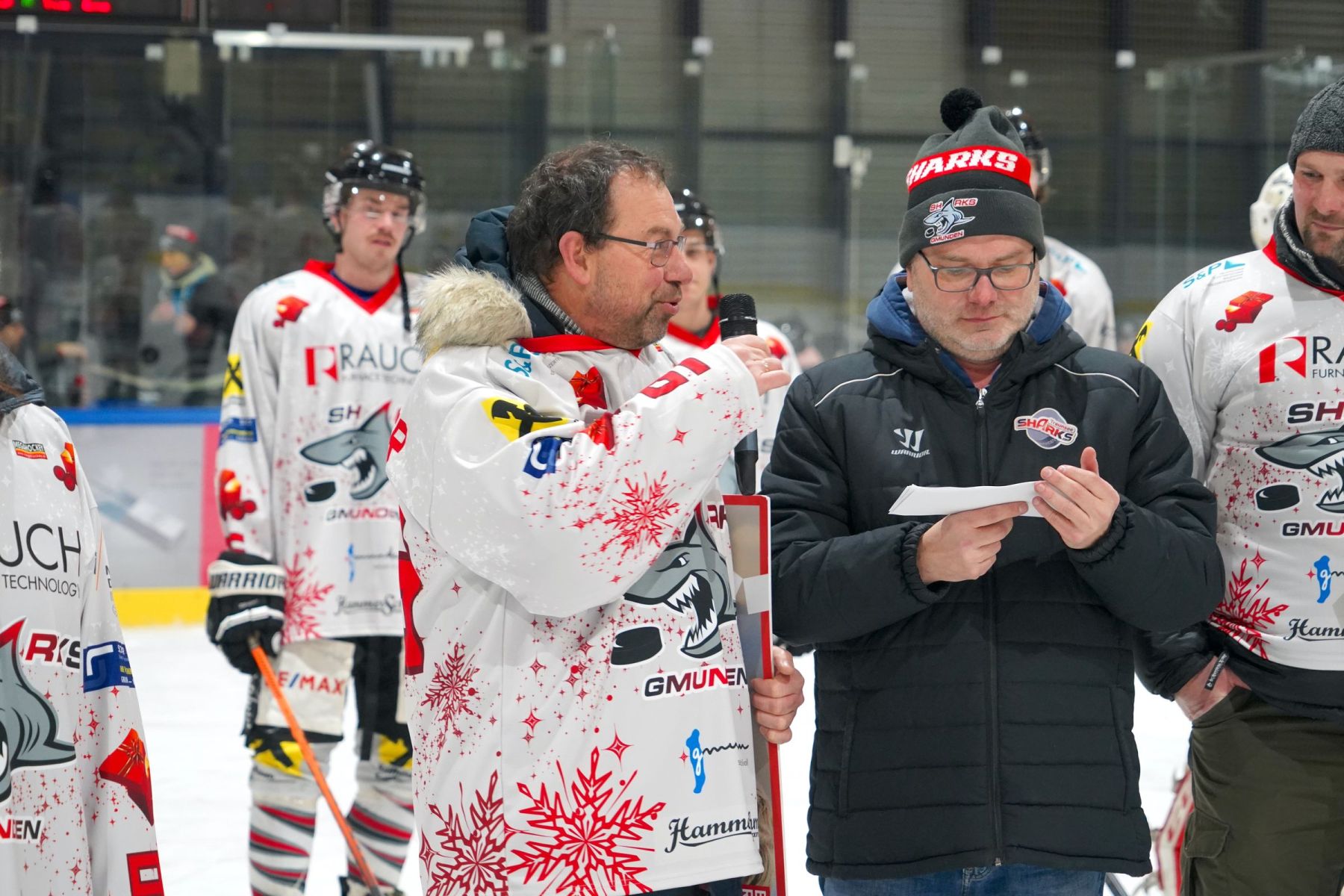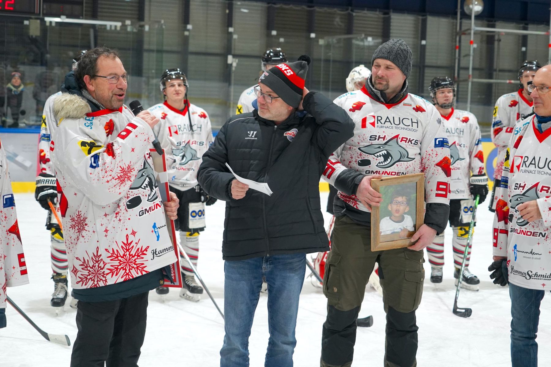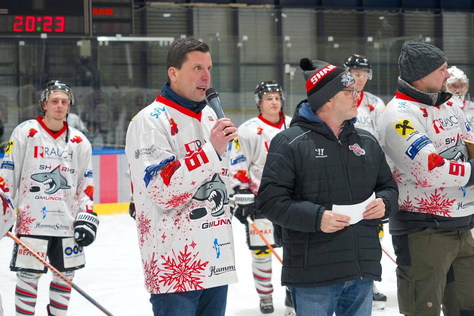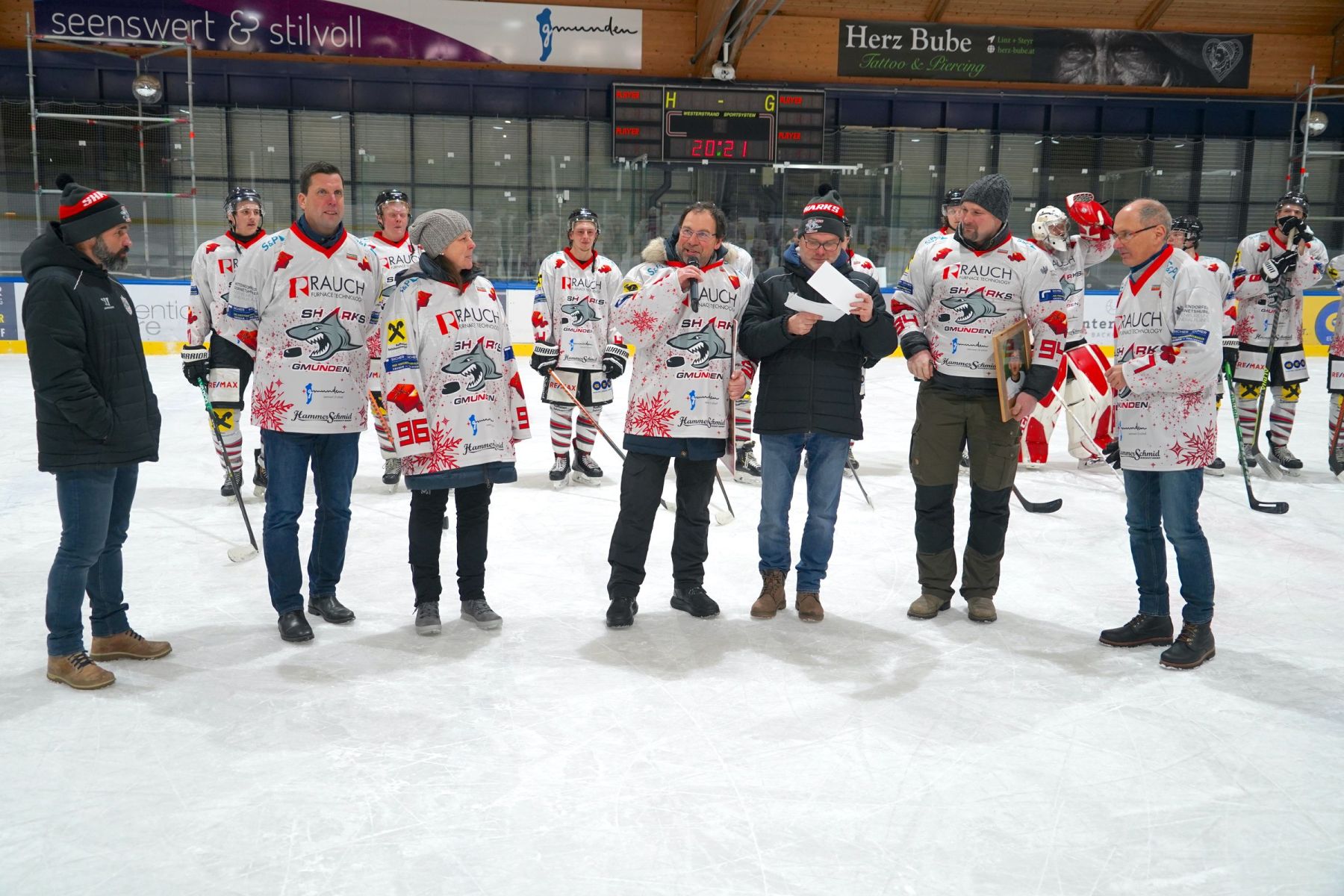 Vor Beginn des Spieles gab es eine Spielervorstellung der Juniorsharks und der gesamten ersten Mannschaft der Gmundner Haie. Michael SCHALK als Hallensprecher konnte unter den vielen Besuchern auch die Bürgermeister Mag. Stefan KRAPF von Gmunden und Ingo DÖRFLINGER aus Kirchham, den Hauptsponsor des Spieles Ing. Karl NEUMANN der Stern HOLDING, Klaus AUTENGRUBER und Kerstin MÜLLER von der Rundschau Salzkammergut und natürlich die Eltern von SAMUEL herzlich begrüßen.