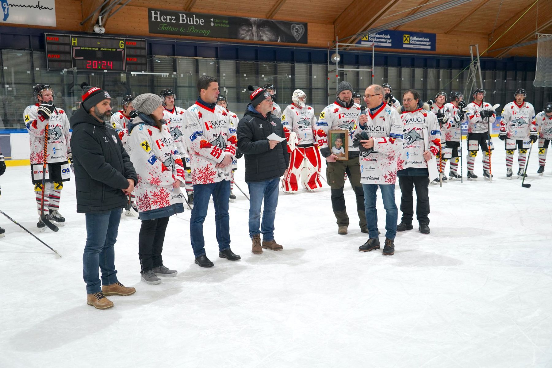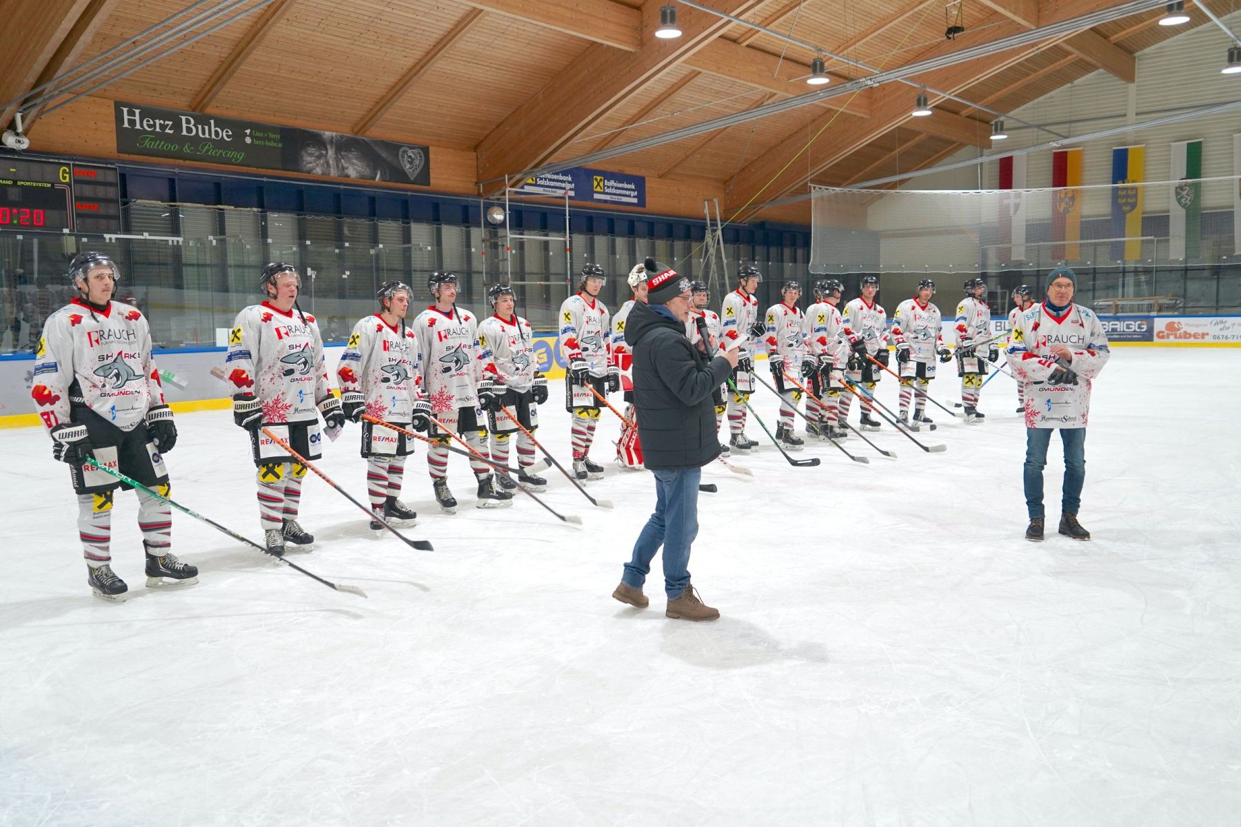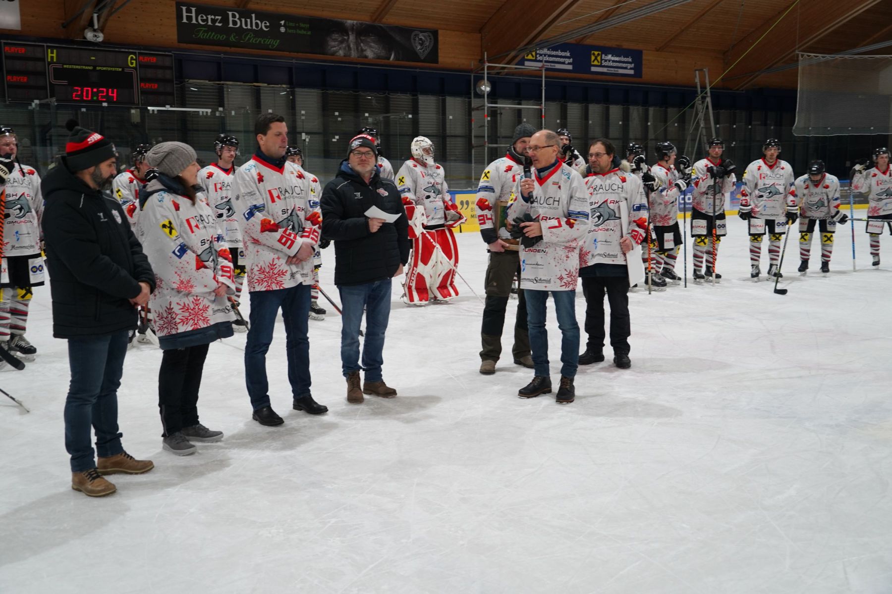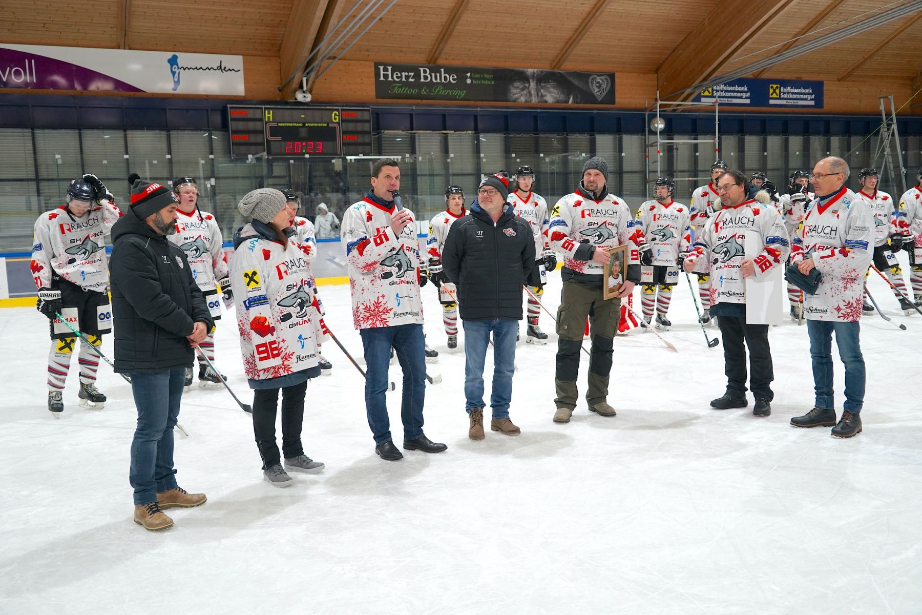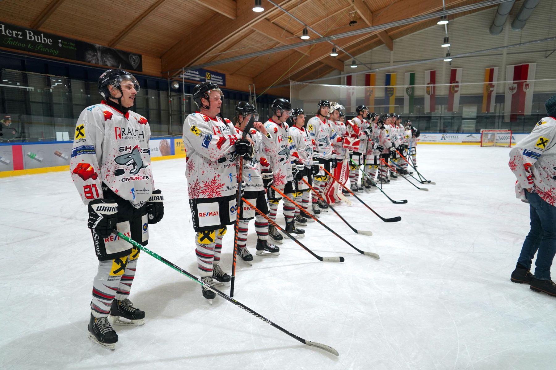 Vor Beginn des Spieles gab es eine Spielervorstellung der Juniorsharks und der gesamten ersten Mannschaft der Gmundner Haie. Michael SCHALK als Hallensprecher konnte unter den vielen Besuchern auch die Bürgermeister Mag. Stefan KRAPF von Gmunden und Ingo DÖRFLINGER aus Kirchham, den Hauptsponsor des Spieles Ing. Karl NEUMANN der Stern HOLDING, Klaus AUTENGRUBER und Kerstin MÜLLER von der Rundschau Salzkammergut und natürlich die Eltern von SAMUEL herzlich begrüßen.